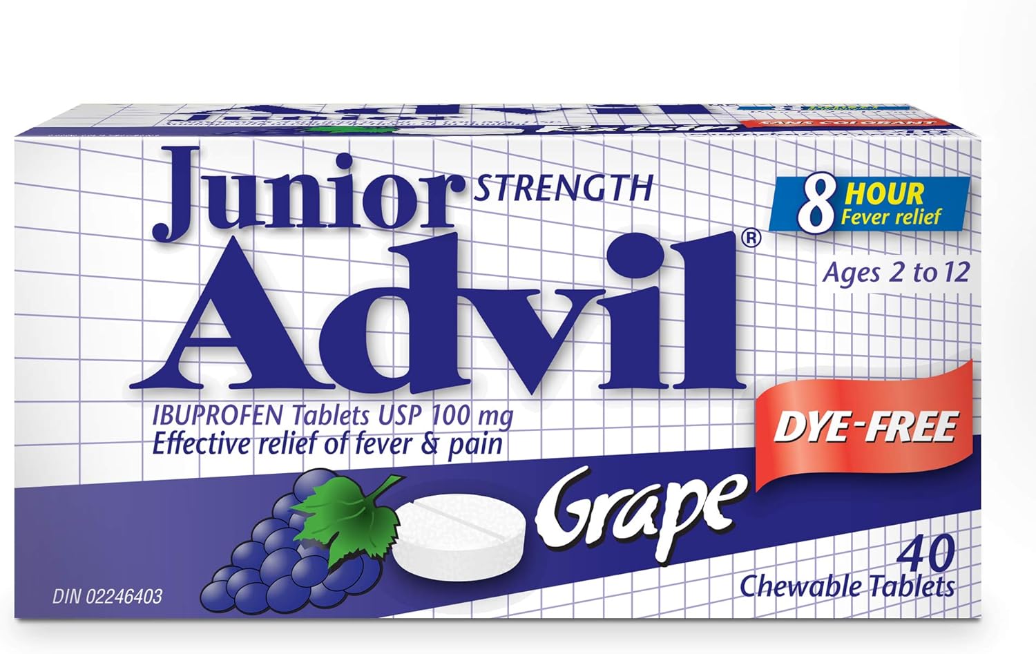 专为 2 至 12 岁儿童配制的 Junior Strength Advil 咀嚼片可退烧并缓解免疫接种、耳痛、感冒或流感以及咽喉痛引起的疼痛。这些方便携带的无色素咀嚼片具有浓郁的葡萄香味,易于剂量控制,儿童服用方便 - 无需剂量杯。每片咀嚼片含有 100 毫克布洛芬,可缓解长达 8 小时的疼痛,让您的孩子恢复童真。35 多年来,Advil 一直提供安全有效的退烧和止痛产品。此包装包含一瓶 40 片装的无色素 Junior Strength Advil 咀嚼片,具有浓郁的葡萄香味。Advil 中的止痛药是布洛芬,一种非甾体抗炎药 (NSAID),按说明服用可安全有效地缓解疼痛和退烧。