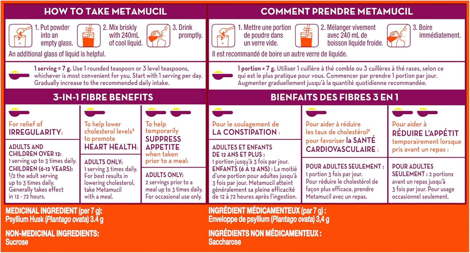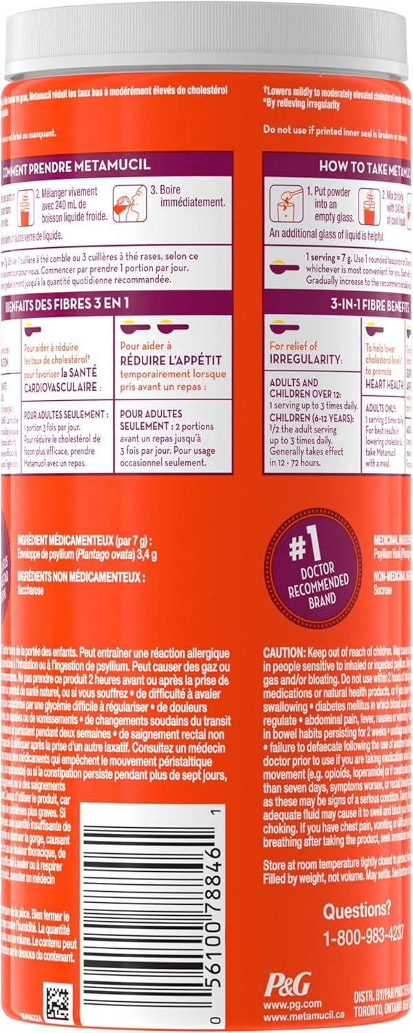 Metamucil, 每日车前子壳粉补充剂,真糖,三合一膳食纤维,促进消化健康,原味顺滑风味饮料,72 份