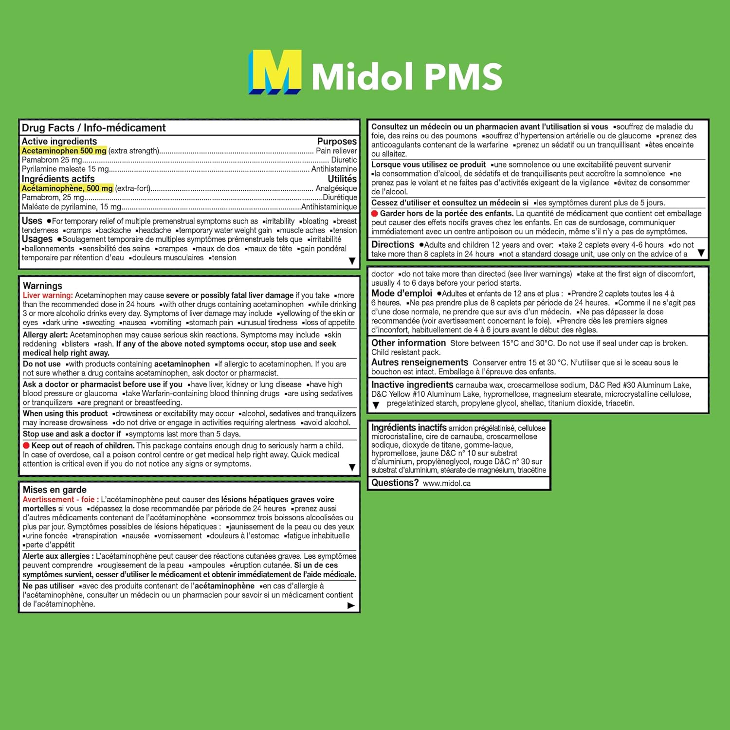 想要强效缓解经前综合症 (PMS) 吗?Midol PMS 强效配方可快速缓解多种经前症状,例如烦躁、腹胀、乳房胀痛、痉挛、背痛、头痛、肌肉酸痛、紧张和暂时性水肿。保持清醒,远离疼痛——Midol PMS 含有强效对乙酰氨基酚 (500 毫克),可快速缓解经前疼痛症状,例如痉挛、头痛、背痛、肌肉酸痛和紧张。Midol PMS 含有对乙酰氨基酚(一种止痛药)、帕马溴(一种利尿剂)和马来酸吡拉明(一种抗组胺药),可对抗水肿。Midol PMS 强效配方采用易于服用的胶囊剂型。成人和 12 岁及以上儿童每 4-6 小时服用 2 粒胶囊。为确保本产品适合您,请务必阅读并遵循标签上的说明。使用方法:暂时缓解多种经前症状,例如烦躁、腹胀、乳房胀痛、痉挛、头痛、背痛、肌肉酸痛、暂时性水肿和紧张感。剂量:成人及12岁及以上儿童,每4-6小时服用2粒胶囊。24小时内请勿服用超过8粒胶囊。警告:为确保本产品适合您,请务必阅读并遵循标签上的说明。
