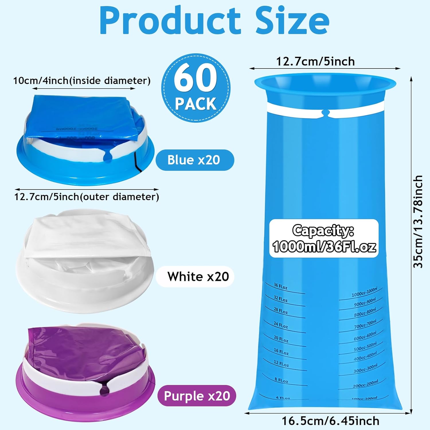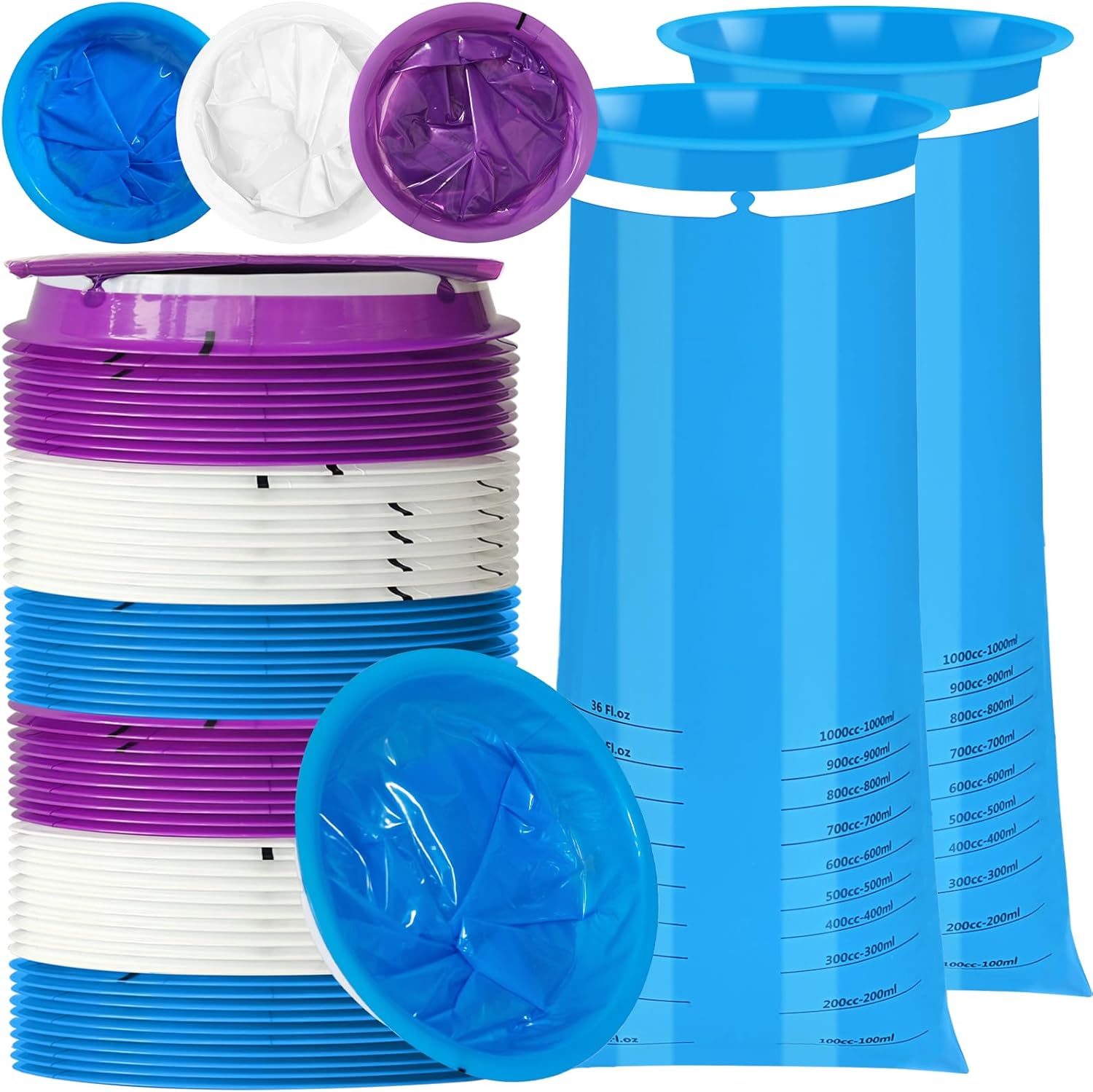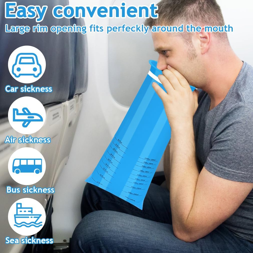 一次性呕吐袋,60 个装呕吐袋,1000 毫升成人儿童一次性呕吐袋,便携式呕吐袋,恶心袋,用于汽车旅行晕车的呕吐袋,防漏呕吐袋由优质材料制成,可防止溢出、防漏和防撕裂。使用完呕吐袋后,只需将袋子扭转并固定在缺口环中,即可密封并消除异味。呕吐袋重量轻,可堆叠设计,可轻松存放在任何地方。呕吐袋有 3 种颜色(蓝色、紫色、白色),表面不透明,可保护隐私并隐藏内容物。呕吐袋适用于各种情况,包括旅行、晕车、乘车等。规格:颜色:20 个蓝色、20 个紫色、20 个白色容量:1000 毫升/36 液体盎司包装包括:60 个呕吐袋