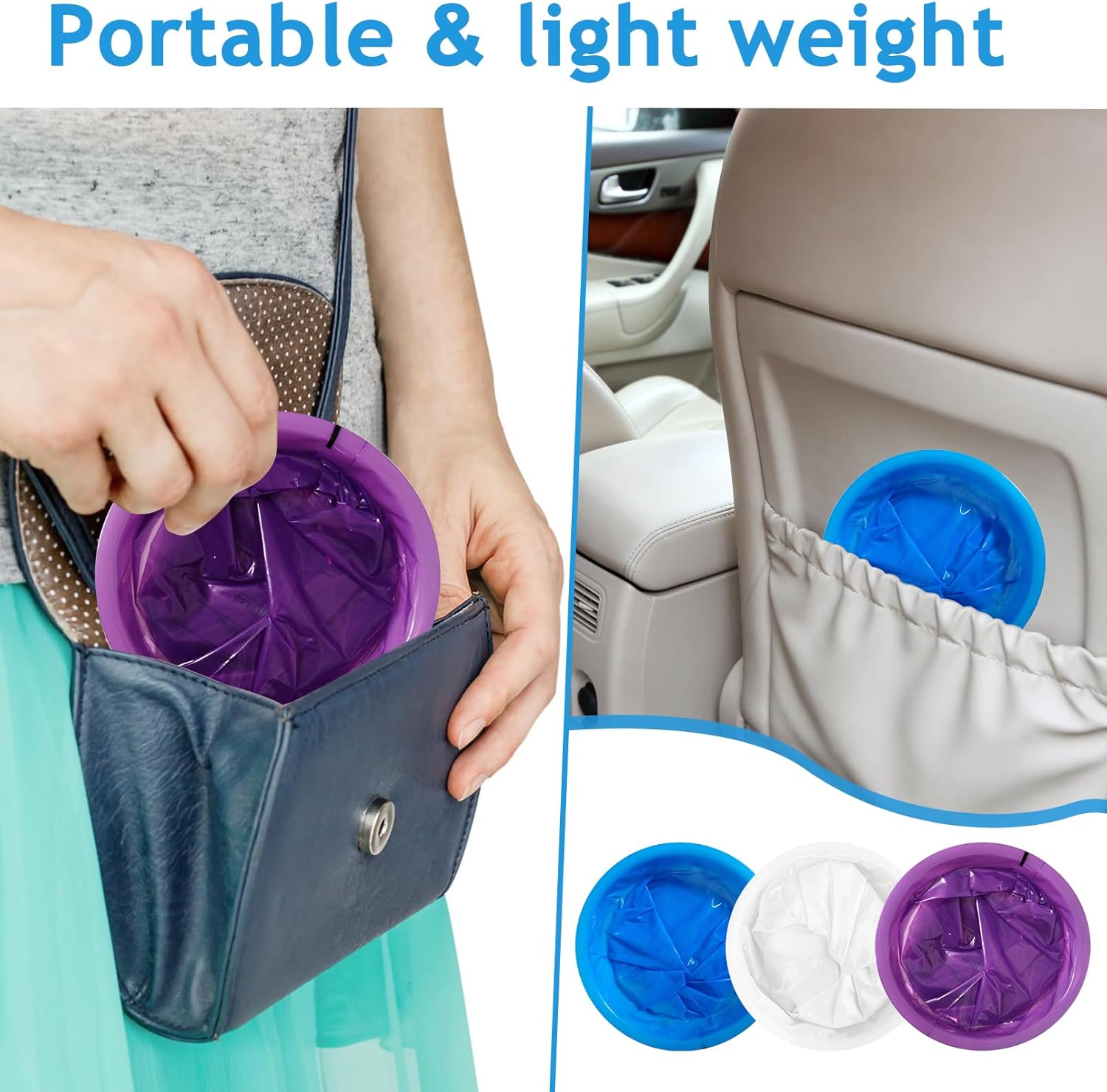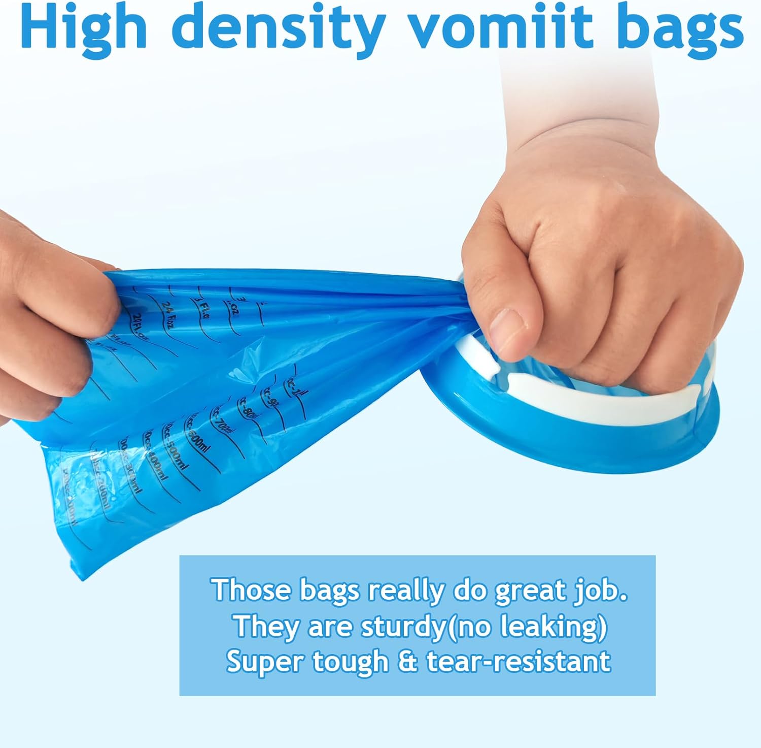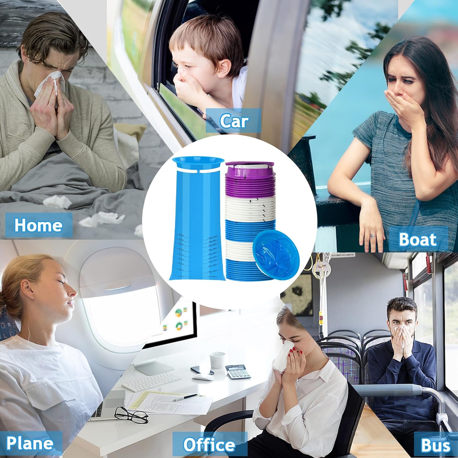 一次性呕吐袋,60 个装呕吐袋,1000 毫升成人儿童一次性呕吐袋,便携式呕吐袋,恶心袋,用于汽车旅行晕车的呕吐袋,防漏呕吐袋由优质材料制成,可防止溢出、防漏和防撕裂。使用完呕吐袋后,只需将袋子扭转并固定在缺口环中,即可密封并消除异味。呕吐袋重量轻,可堆叠设计,可轻松存放在任何地方。呕吐袋有 3 种颜色(蓝色、紫色、白色),表面不透明,可保护隐私并隐藏内容物。呕吐袋适用于各种情况,包括旅行、晕车、乘车等。规格:颜色:20 个蓝色、20 个紫色、20 个白色容量:1000 毫升/36 液体盎司包装包括:60 个呕吐袋
