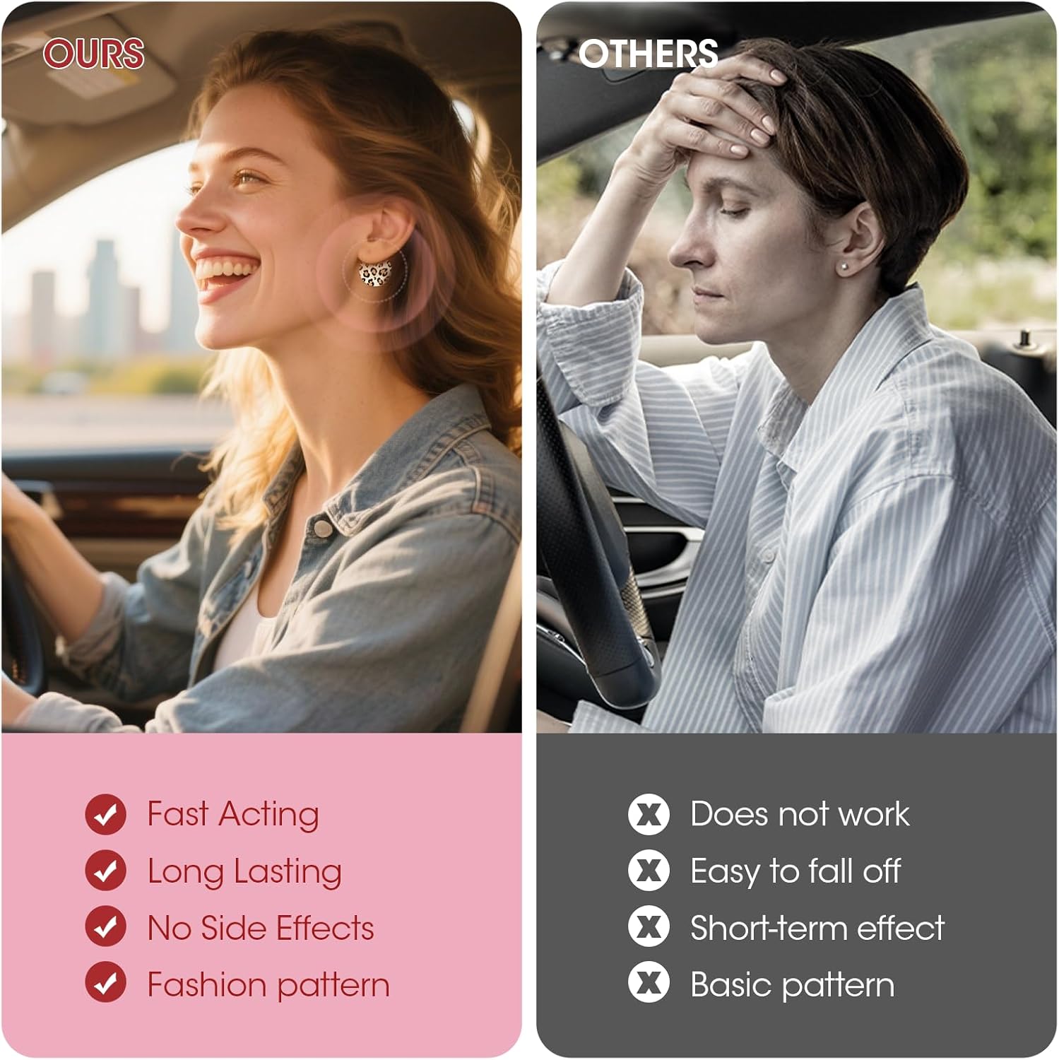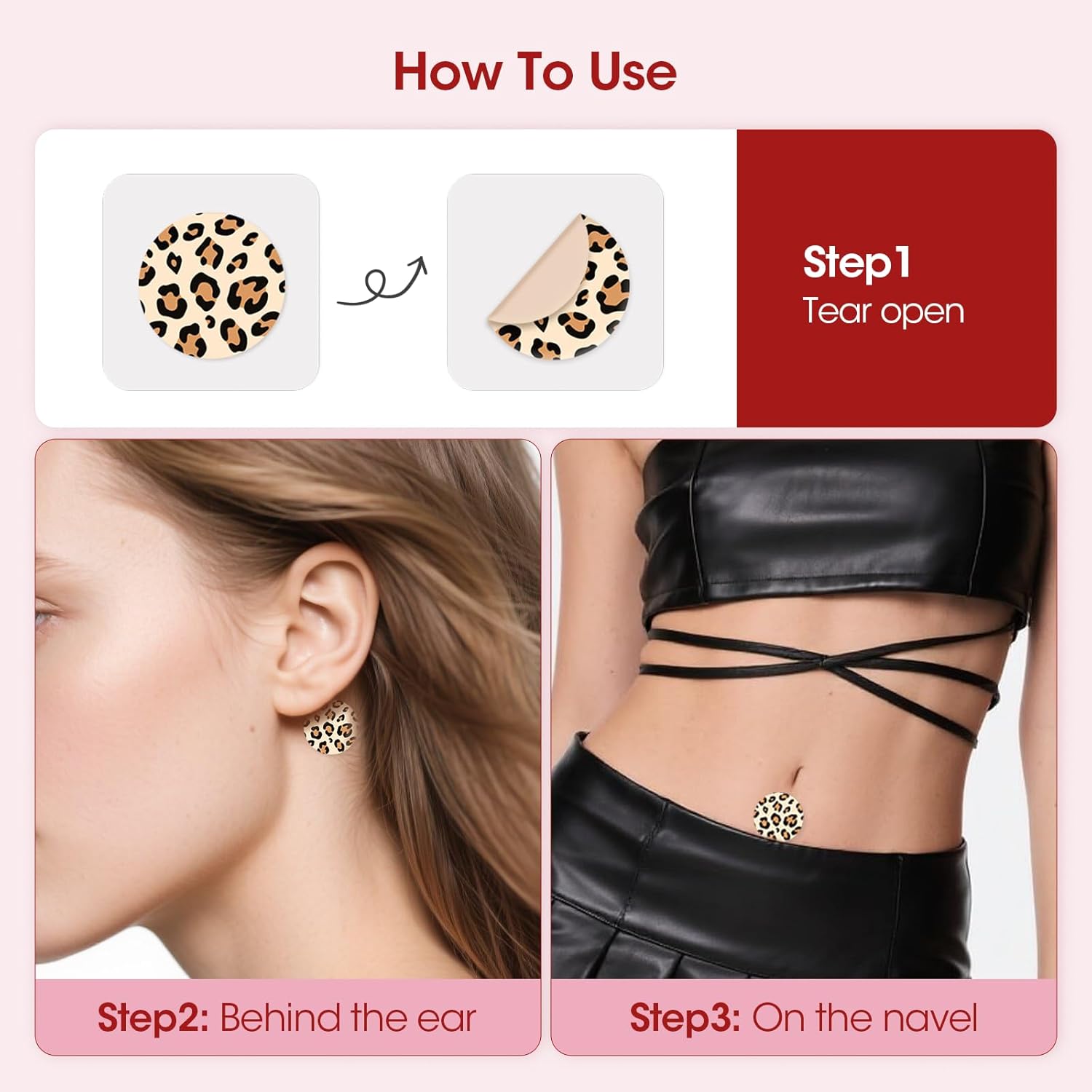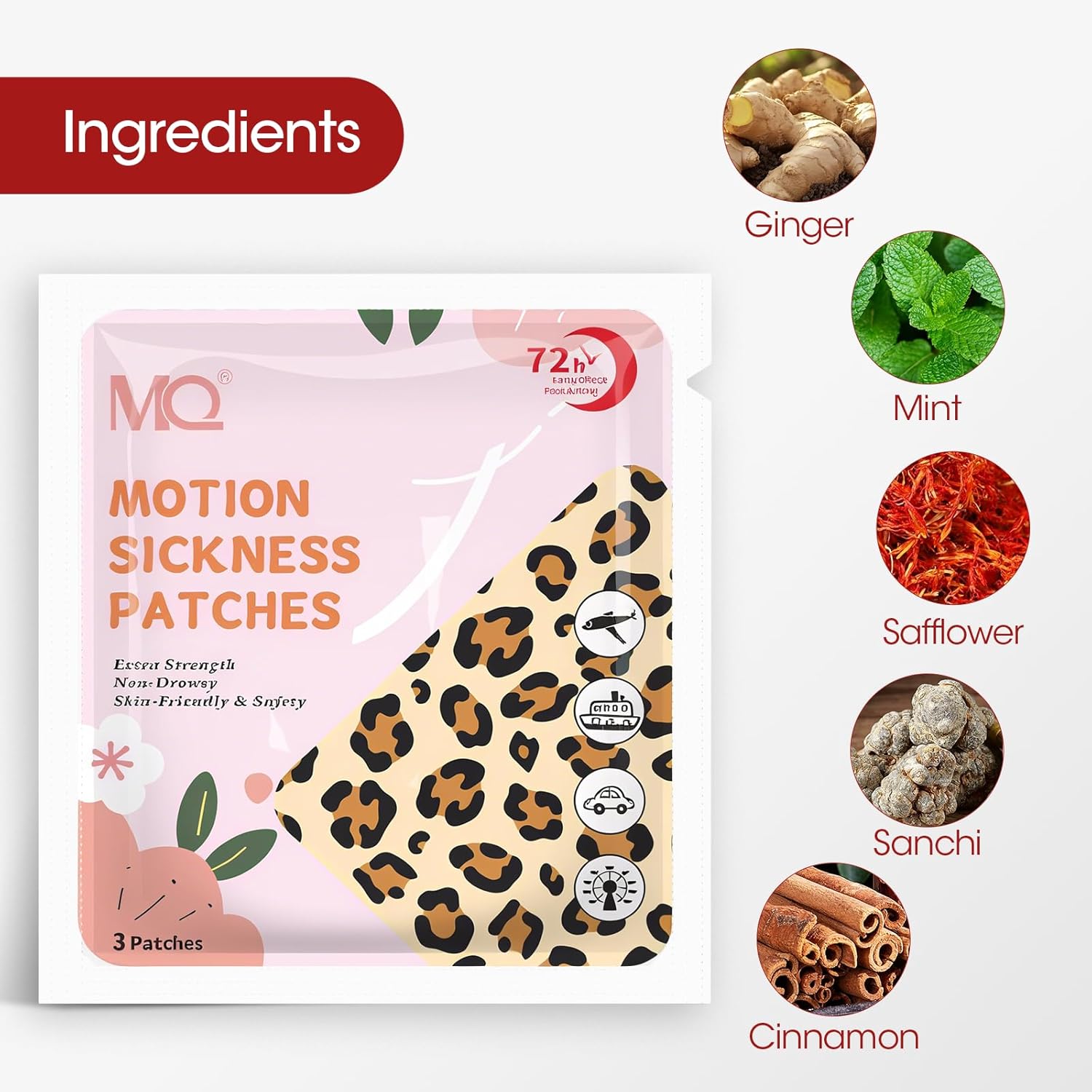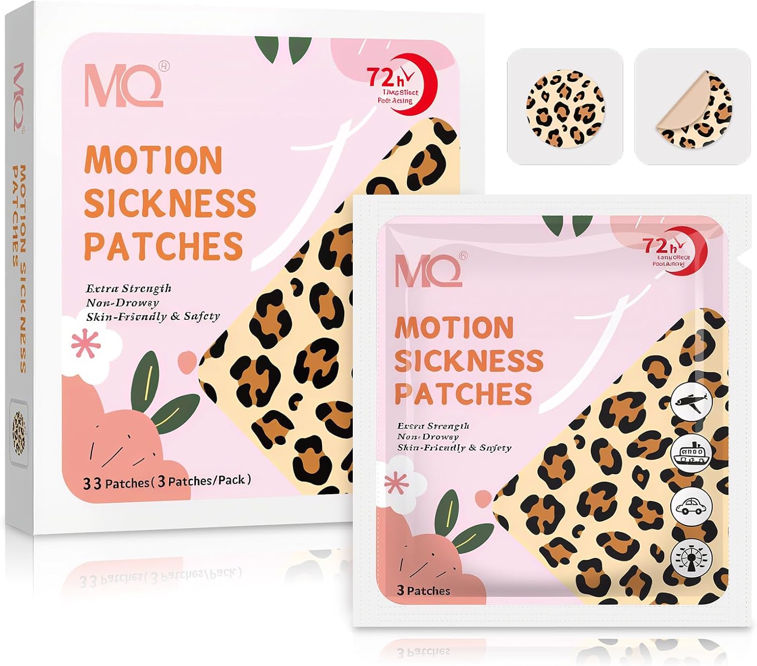 安全有效 - 100% 天然草本,无副作用,不引起困倦。超强效 - 两耳后各贴一片,肚脐贴一片。每包3片,每盒7包。时尚设计 - 专为时尚爱好者打造。不同于沉闷的传统晕车贴,MQ 的豹纹设计为您的穿搭增添一抹时尚气息。快速起效 - 出行前30分钟贴上晕车贴,有效缓解1至3天。广泛适用 - MQ 晕船贴可用于长途汽车、飞机、火车、游轮、3D游戏、渡轮和游乐园等各种晕船场景。