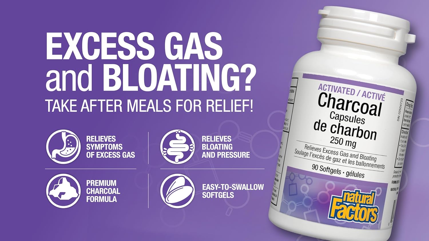 帮助缓解胀气和腹胀:Natural Factors 活性炭胶囊采用优质配方,可缓解胀气症状。本品适合餐后服用,可缓解胀气引起的腹胀、腹压、疼痛、饱胀和闷胀感。服用方便:活性炭胶囊采用独特的软胶囊外壳,比普通的白垩胶囊更方便吞咽。每粒软胶囊含 250 毫克优质活性炭,适用于成人和 12 岁及以上儿童。DIN 编号:02504723。有效期格式:EXP MMYYYY,位于侧面板上批号后。