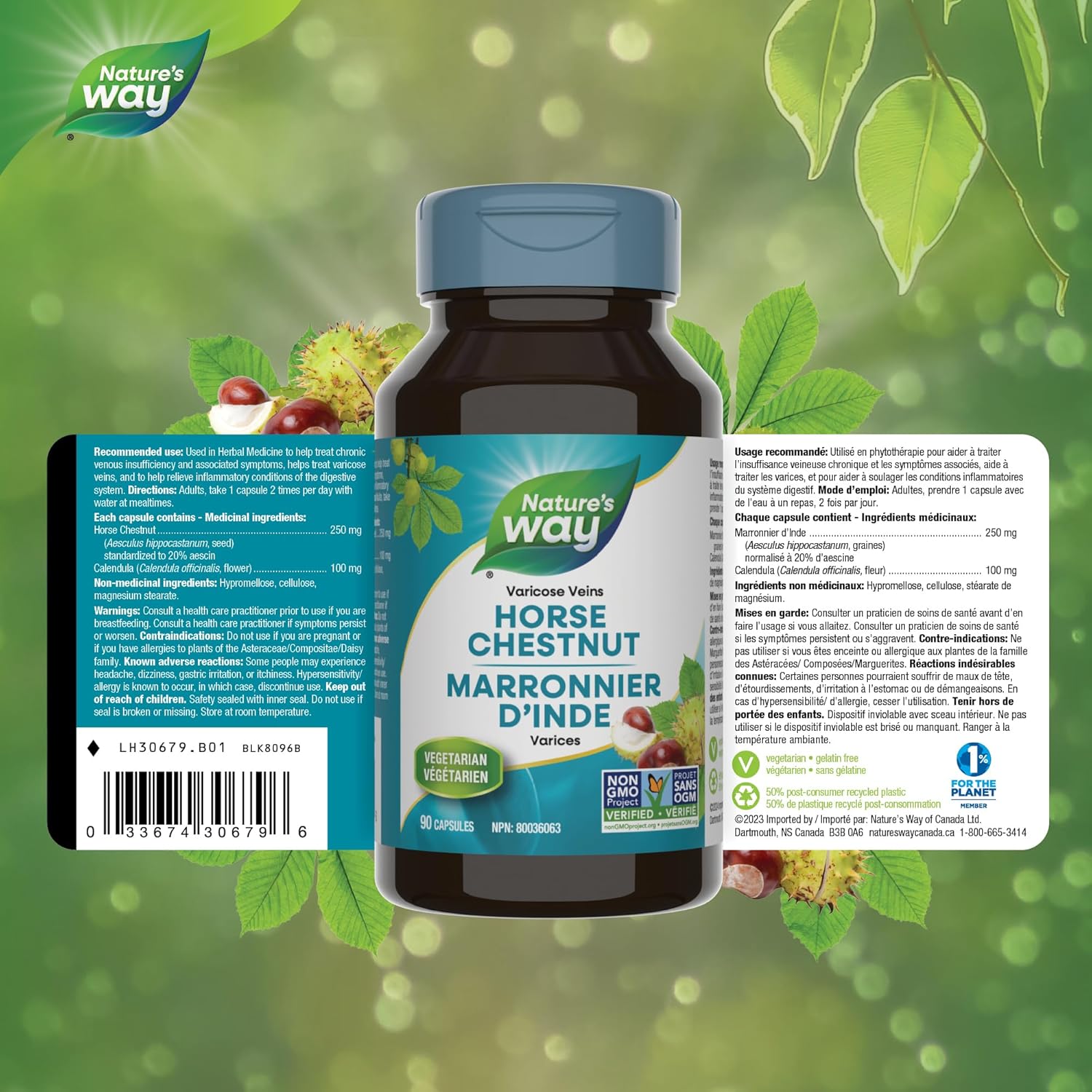 Nature’s Way 七叶树 – 有助于治疗静脉曲张和缓解消化系统炎症 – 七叶树种子和金盏花 - 90 粒素食胶囊