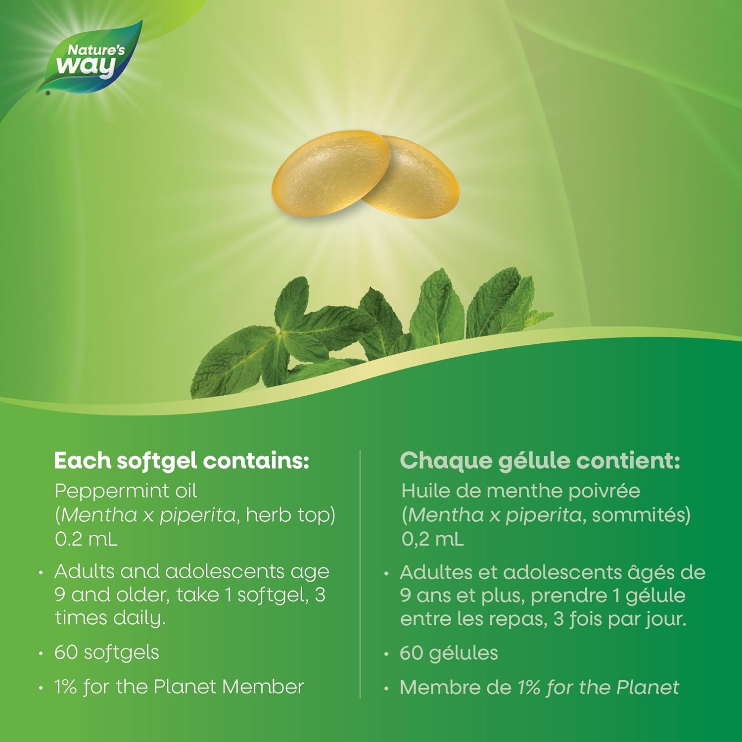 NATURE'S WAY PEPOGEST 薄荷油软胶囊:Nature's Way Pepogest 薄荷精油有助于缓解肠易激综合征 (IBS) 引起的腹痛、胀气和腹胀。我们致力于使用纯净的成分,并经过严格的测试,这使我们赢得了加拿大最值得信赖的天然产品品牌之一的声誉。我们目前的举措使我们的生产过程专注于限制我们的碳足迹,我们的瓶子 50% 由消费后回收塑料制成。为了您的利益,Pepogest 由纯净、高品质的天然成分制成,经过严格的测试,并通过了非转基因项目验证。9 岁及以上的成人和青少年,每天 3 次,每次 1 粒软胶囊,两餐之间服用,或遵医嘱。Nature's Way 草本补充剂、益生菌和 Omega-3 的配方使您的健康习惯变得简单。我们相信健康始于内心,Nature's Way 产品可以帮助您保持健康并享受人生的乐趣。
