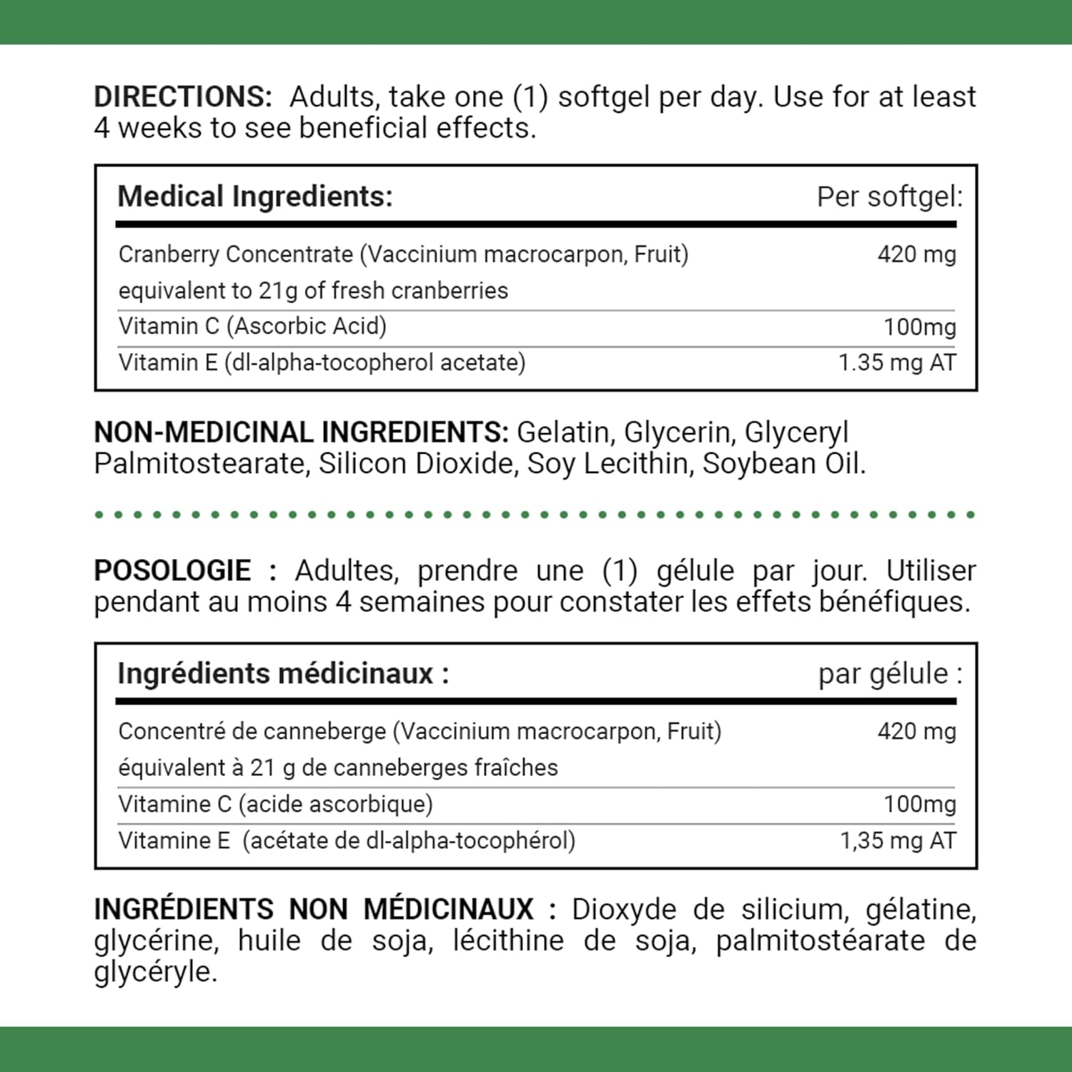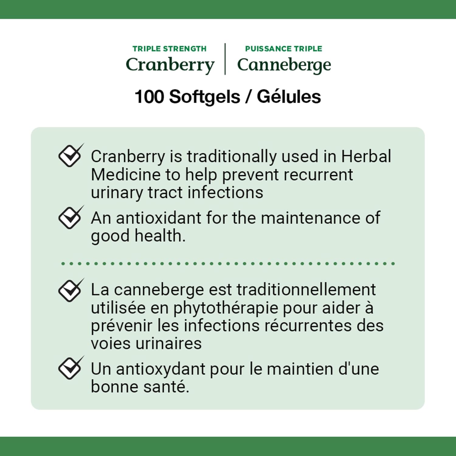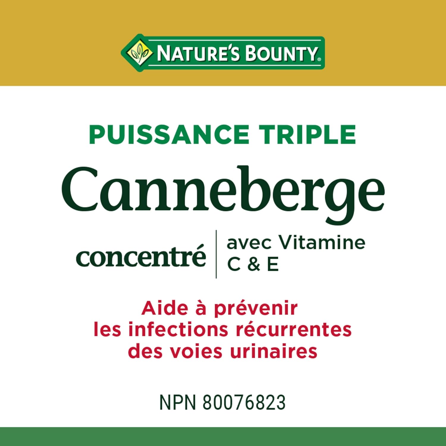 40多年来,NATURE'S BOUNTY 始终以您为中心,研发维生素和营养补充剂。您服用维生素是为了帮助身体保持最佳状态——那么,何必纠结于其他维生素品牌呢?今天就来试试 NATURE'S BOUNTY 吧!NATURE'S BOUNTY 三倍强效蔓越莓浓缩液,富含维生素 C 和 E,传统上用于草药,有助于预防复发性尿路感染。此外,它还富含抗氧化剂,有助于维持身体健康。每粒软胶囊含有 420 毫克蔓越莓浓缩液、100 毫克维生素 C 和 1.35 毫克维生素 E,以及明胶、甘油、棕榈硬脂酸甘油酯、二氧化硅、大豆卵磷脂和大豆油。成人每日服用一 (1) 粒软胶囊。服用至少 4 周即可见效。