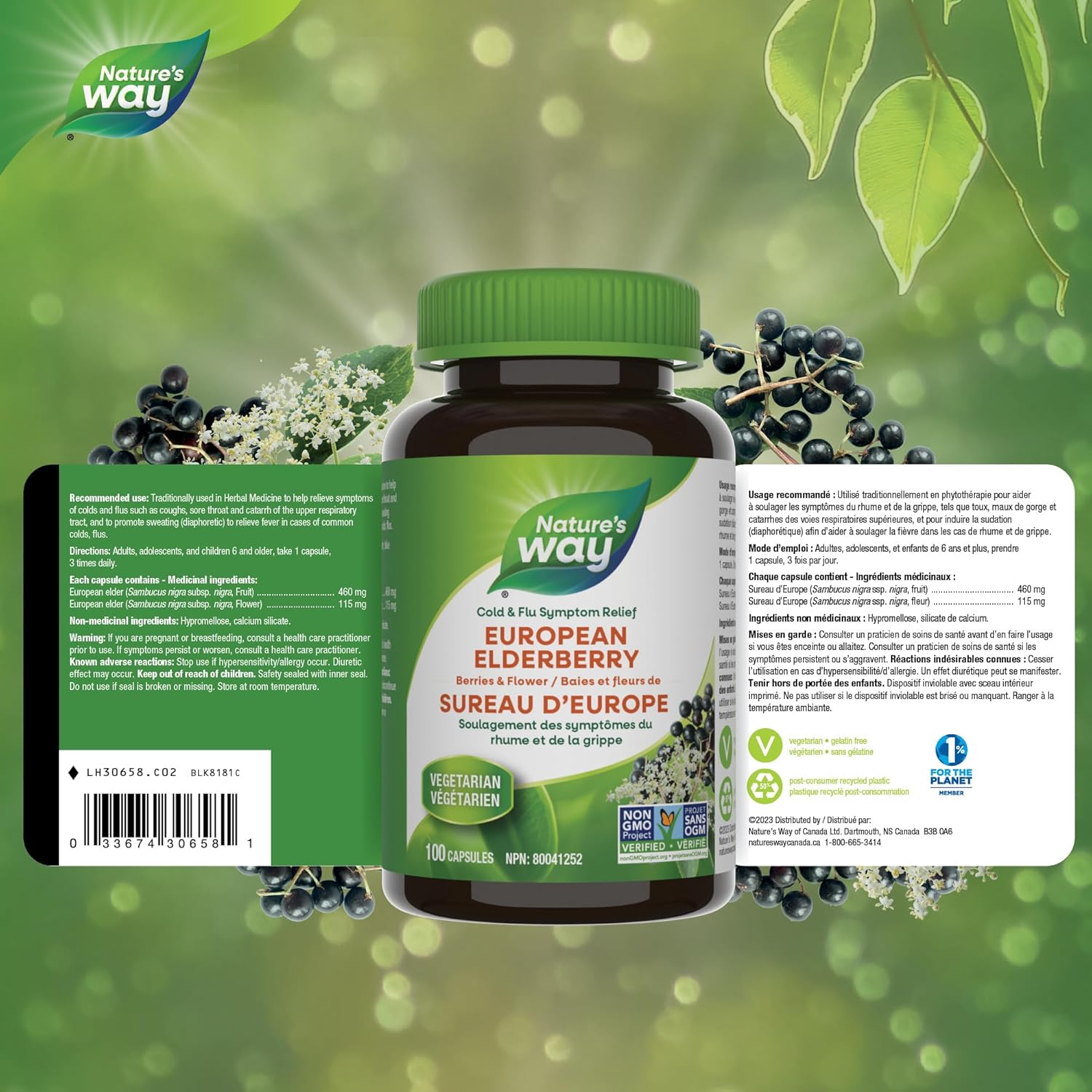 Nature's Way 欧洲接骨木胶囊 - 缓解感冒和流感症状 - 咳嗽、咽喉痛支持补充剂 - 接骨木浆果和花 - 非转基因认证 - 素食 - 成人和儿童适用 - 100 粒胶囊