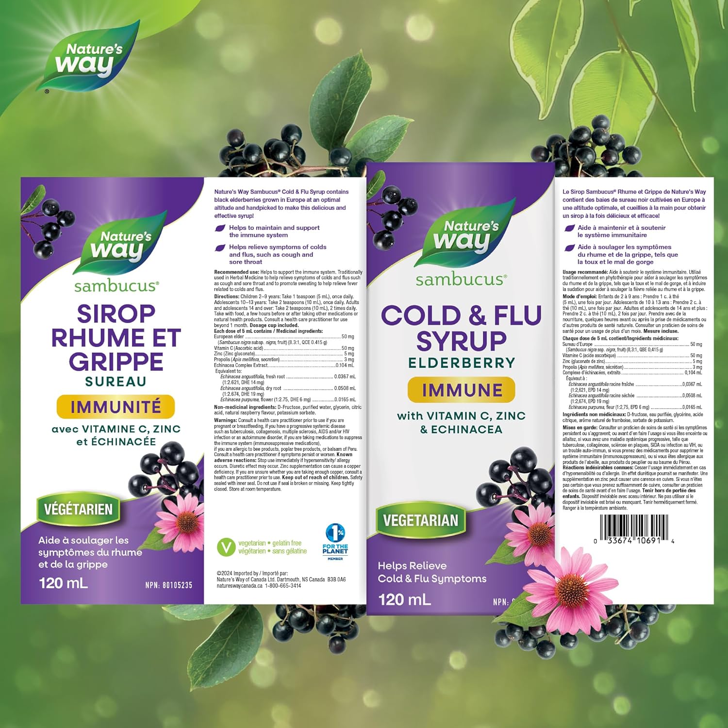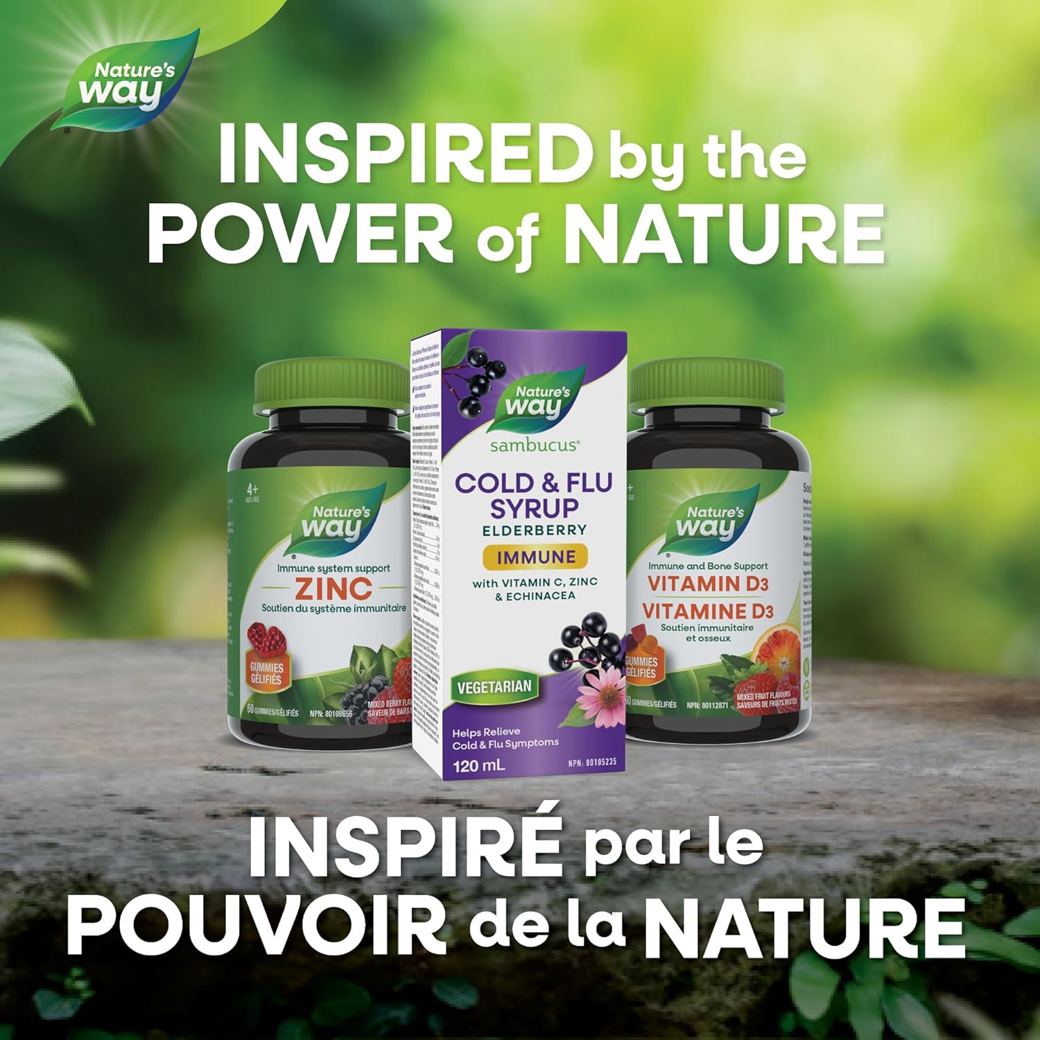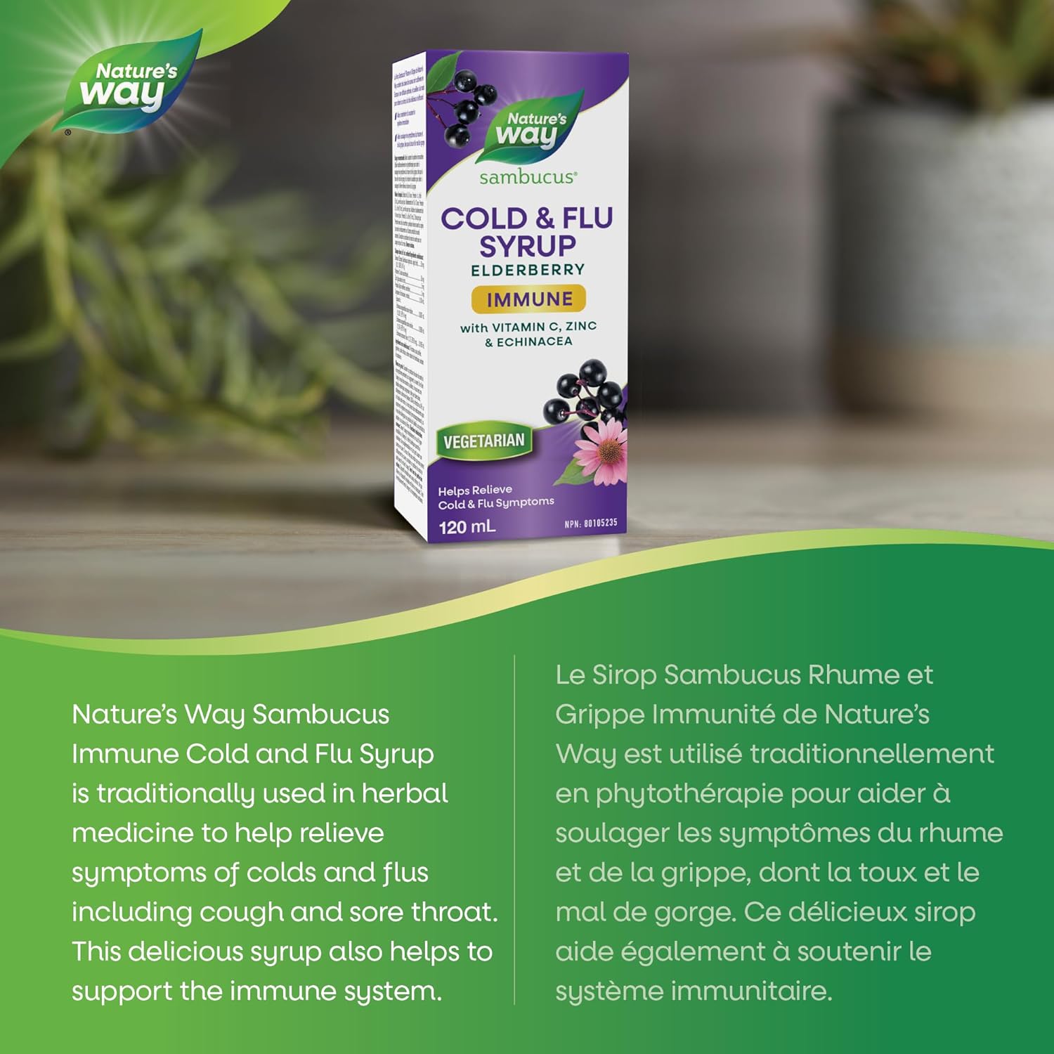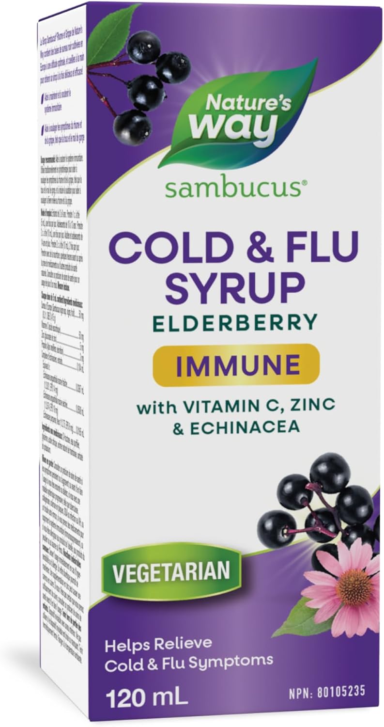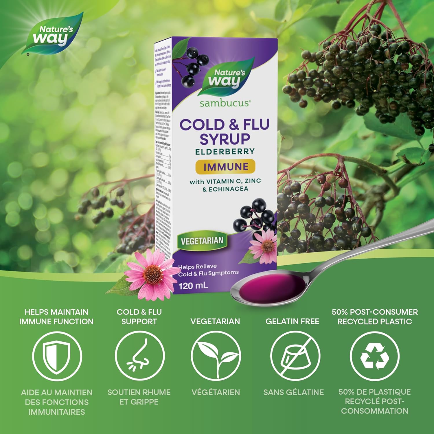 Nature's Way 接骨木感冒和流感护理免疫维生素 C 和锌 - 接骨木糖浆与紫锥菊和蜂胶 - 用于缓解 2 岁以上儿童和成人症状的草药,120 毫升