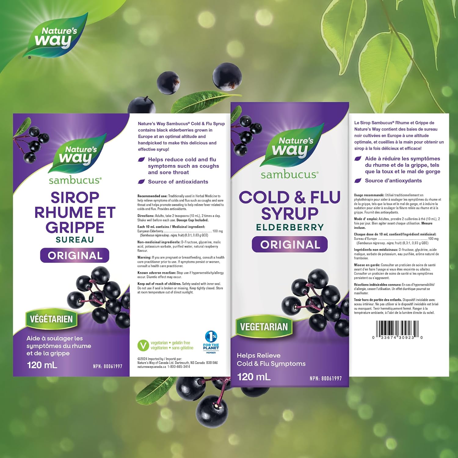 Nature's Way 接骨木感冒和流感护理原味 - 草药接骨木糖浆,有助于缓解成人症状(咳嗽和喉咙痛),120 毫升