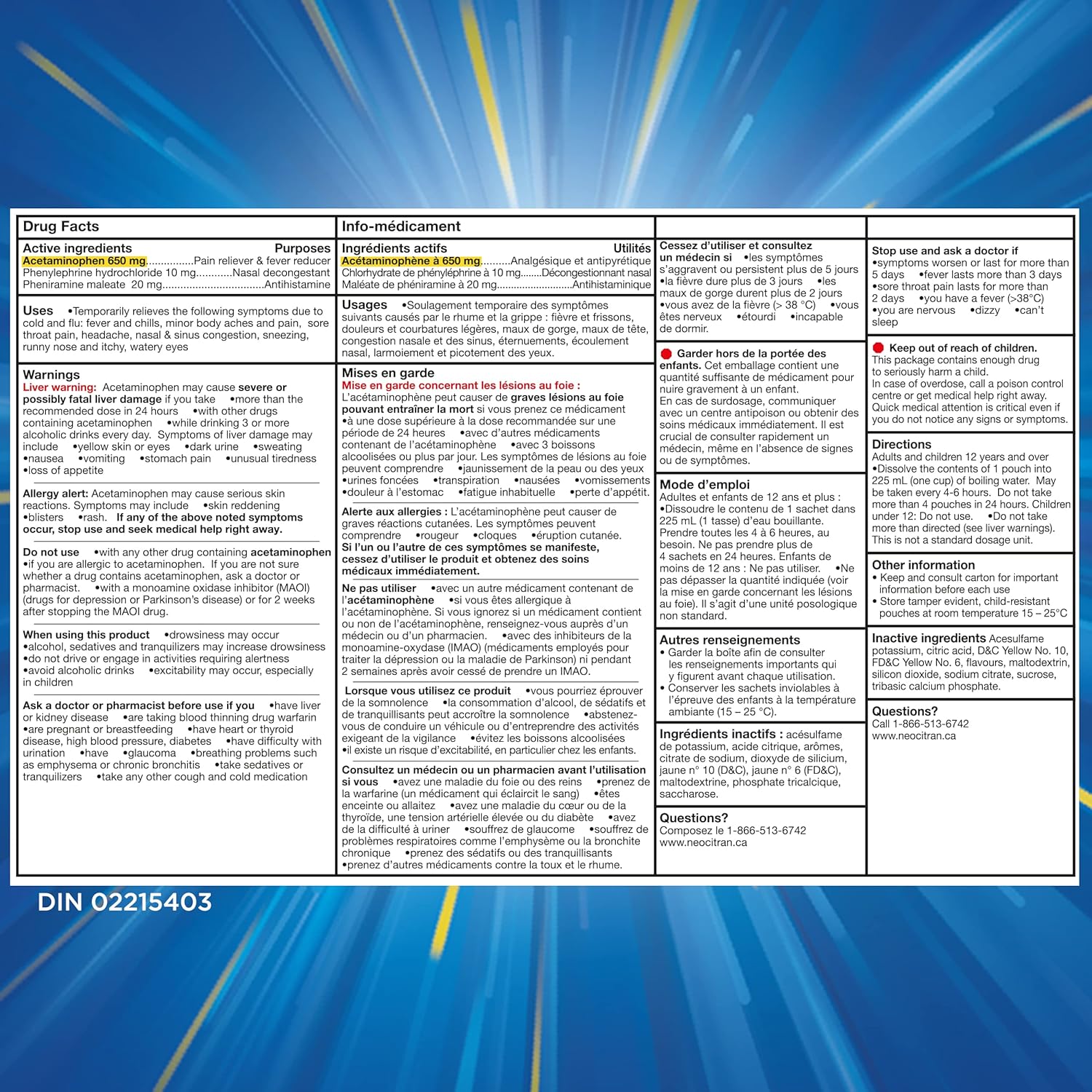 NeoCitran 强效感冒鼻窦夜间柠檬味冲剂是一款美味的夜间感冒鼻窦药。蕴含我们最受欢迎的配方,可有效缓解咽喉痛、头痛、鼻窦和鼻塞、流鼻涕和打喷嚏,让您安心休息。只需将单剂量袋装冲剂溶于沸水中,即可制成一杯舒缓的柠檬味睡前饮品。另有苹果肉桂味冲剂可供选择。适用于成人和12岁及以上儿童。不妨试试 NeoCitran 的日间配方,白天也能轻松缓解困倦。本包装包含10个方便的单剂量袋装冲剂。为确保本产品适合您,请阅读并遵循标签上的说明。商标归 Haleon 所有或授权。©2023 Haleon 或其授权方。