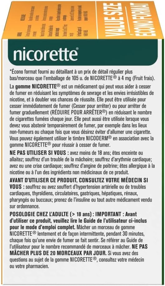 尼古丁口香糖,含 4 毫克尼古丁,新鲜水果味,210 片超值装,尼古丁口香糖,含 4 毫克尼古丁,新鲜水果味,210 片,可快速缓解您的烟瘾和戒断症状,帮助您戒烟。每片口香糖含有 4 毫克尼古丁,有助于抑制吸烟欲望,并有助于减轻令人不适的戒断症状。正确使用尼古丁口香糖可使您戒烟的几率比单靠意志力戒烟的几率高出一倍。每当您想吸烟时,就嚼一片尼古丁口香糖,每天最多 20 片。这种尼古丁口香糖适用于每天吸烟量超过 25 支,想要立即戒烟或通过减少每天吸烟量逐渐戒烟的成年人。使用这种尼古丁替代疗法 (NRT) 和戒烟辅助工具,您可以对戒烟充满信心。请使用此图表作为指导,以帮助您戒烟: 第 1 个月 - 前 2 周:每天 10 至 20 片 第 1 个月 - 后 2 周:每天 8 至 15 片 第 2 个月 - 每天 4 至 10 片 第 3 个月 - 每天 2 至 5 片 第四至第 6 个月 - 如果再次想吸烟,则吃 1 片 尼古丁口香糖,新鲜水果味,4 毫克,105 片 尼古丁口香糖可快速缓解您的烟瘾和戒断症状,帮助您戒烟。每片含有 4 毫克尼古丁,这种口香糖有助于抵抗吸烟的渴望,并有助于停止令人不快的戒断症状。正确使用尼古丁口香糖可使您戒烟的几率比单靠意志力高出一倍。每当您想吸烟时,就嚼一片尼古丁新鲜水果味口香糖,每天最多 20 次。这种口香糖适用于每天吸烟超过 25 支、想要立即戒烟或通过减少每天吸烟量逐渐戒烟的成年人。