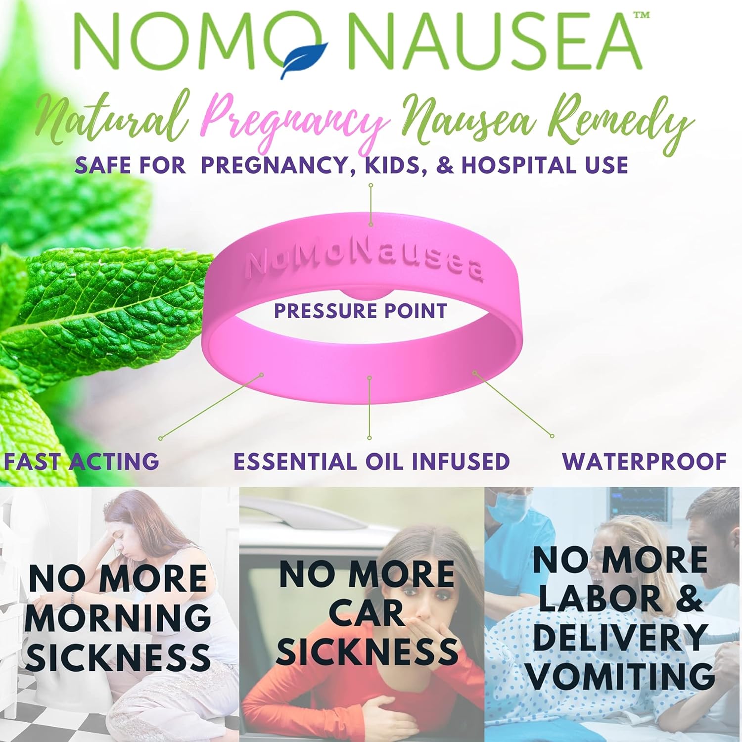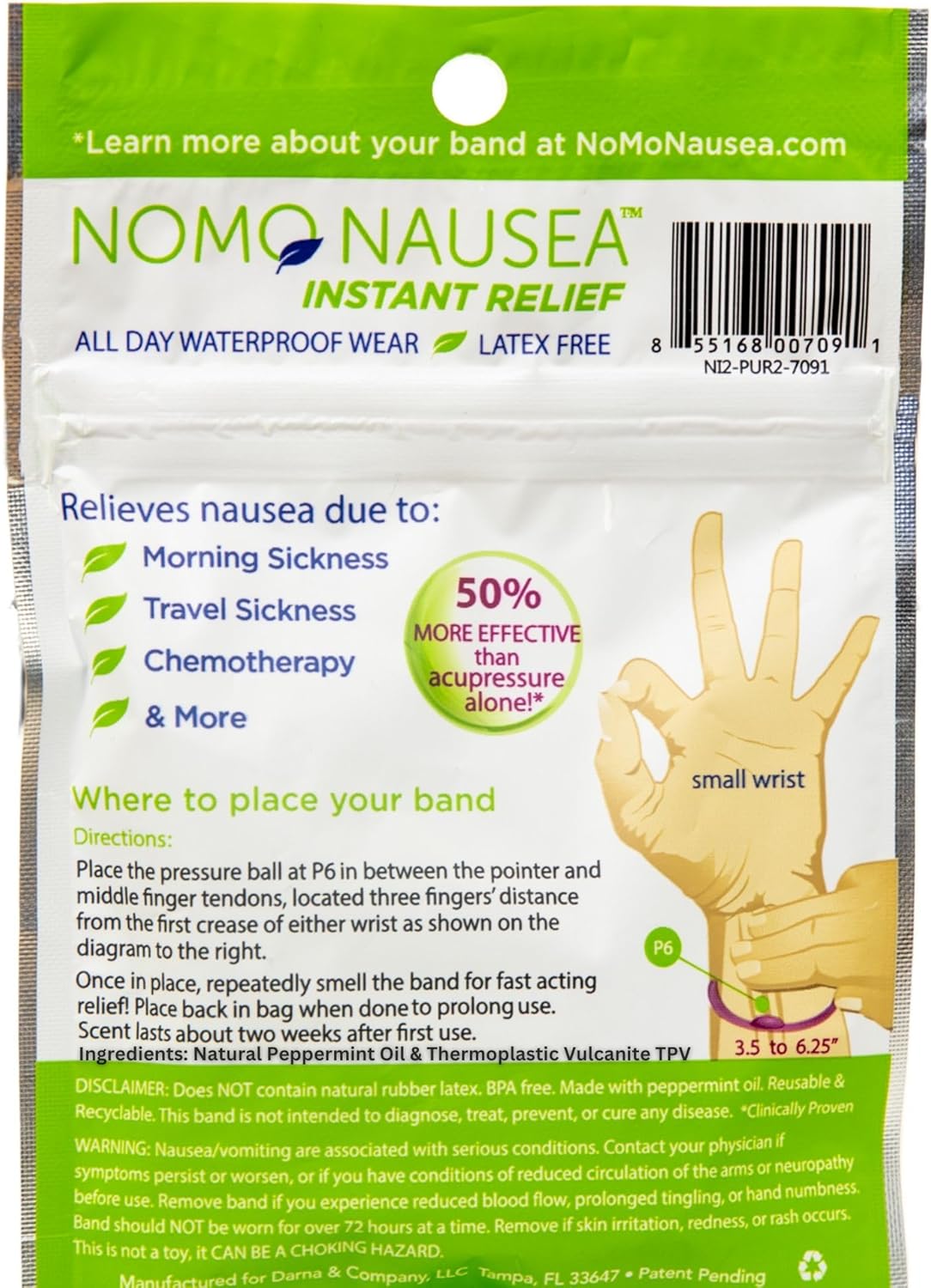 NoMo Nausea Band 在时尚的防水指压腕带中注入了天然薄荷油。这款时尚的弹性儿童腕带套装包含两条,不含药物、不含乳胶,适合手腕周长超过 3.5-6.2 英寸的超小号至小号人士佩戴,可立即缓解恶心。我们采用全新、更坚固、更具弹性的材质,无需费心猜测,即可在 P6 针灸部位施加恰到好处的压力,有效缓解恶心。我们经临床验证并由医生推荐的 3:1 指压和薄荷香薰手环已被证明能够减轻术后恶心呕吐、晕动病、晨吐、眩晕、化疗、宿醉等症状。它们是如何起作用的?我们的 3:1 设计融合了以下元素:1. 快速起效的薄荷香薰疗法,可在 30 秒内止吐,因为药物进入大脑的最快途径是通过鼻子。2. 薄荷精油分散注意力技术,可改变腕部温度,让您忘记自己生病了。3. 持久指压,可增加抗恶心激素,帮助缓解恶心。在恶心开始之前就用上。所以,一个腕带就能拥有三种强效的止吐产品!由于采用了多模式方法,新的研究表明,你一次只需佩戴一种。