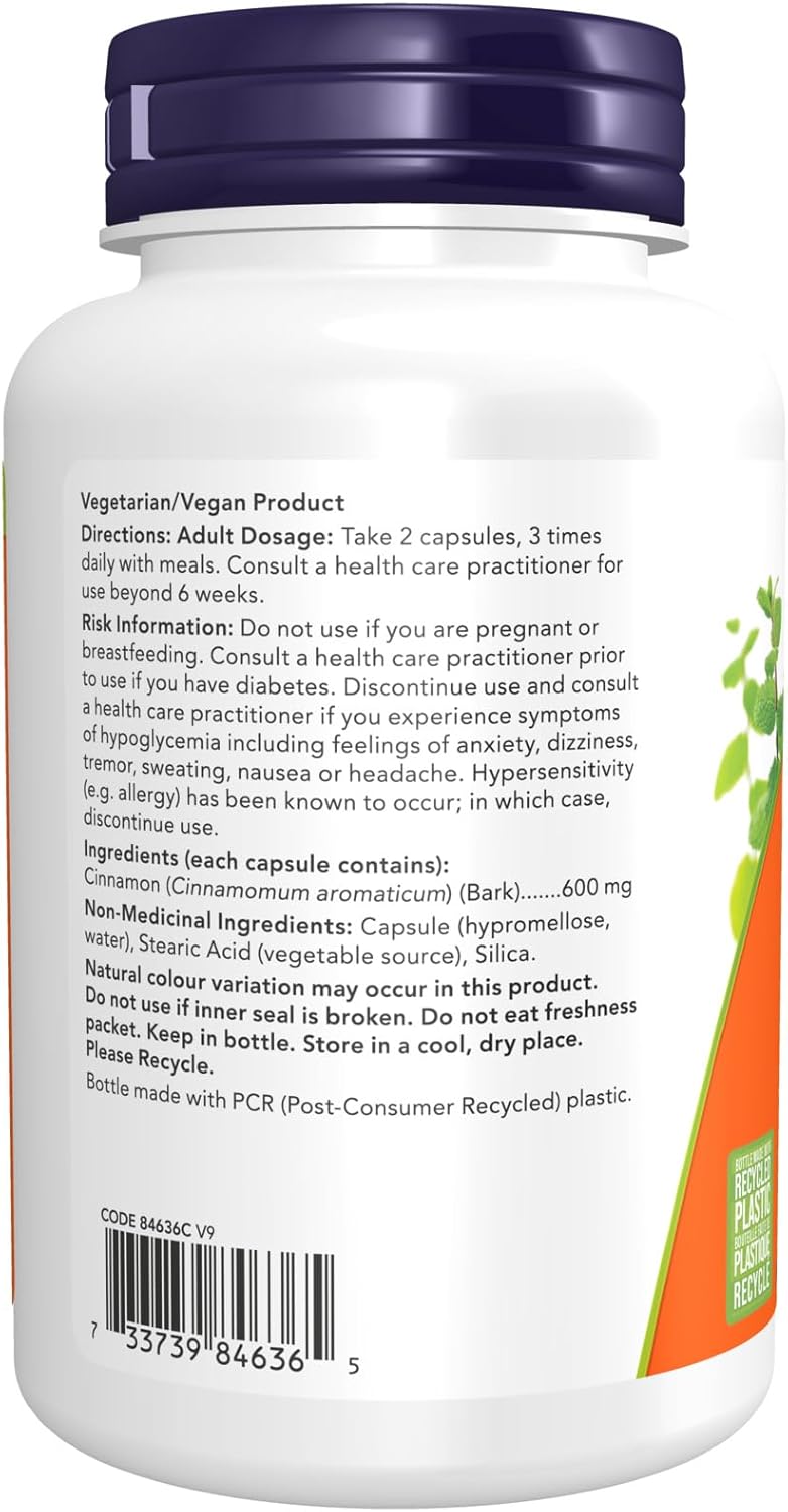 NOW Supplements, 肉桂皮 600 毫克,经非转基因项目验证,促进健康葡萄糖代谢,120 粒素食胶囊