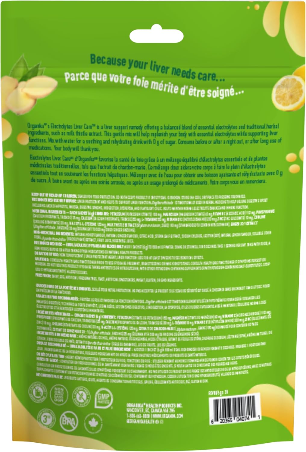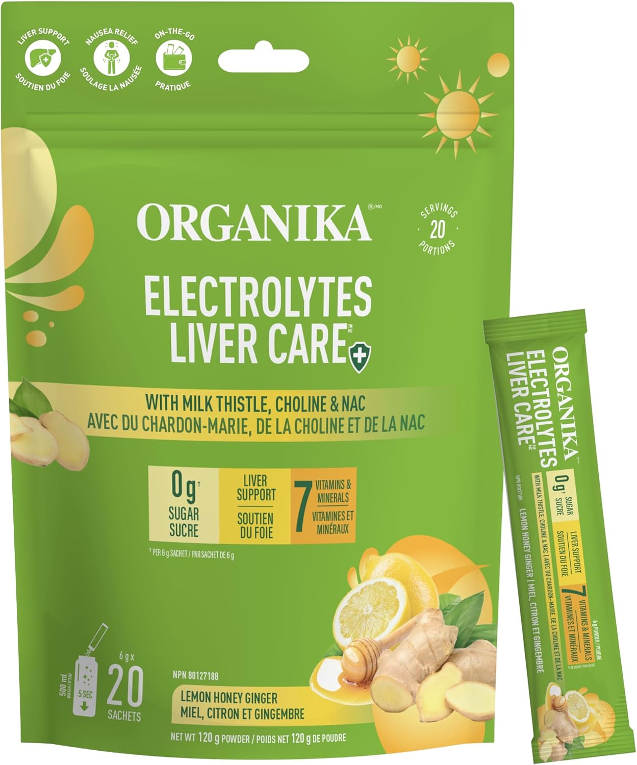 Organika 加拿大制造电解质护肝片,含奶蓟草、胆碱和 NAC - 柠檬蜂蜜姜味 - 肝脏支持 + 保护、电解质平衡、免疫支持、无糖 6g x 20 片