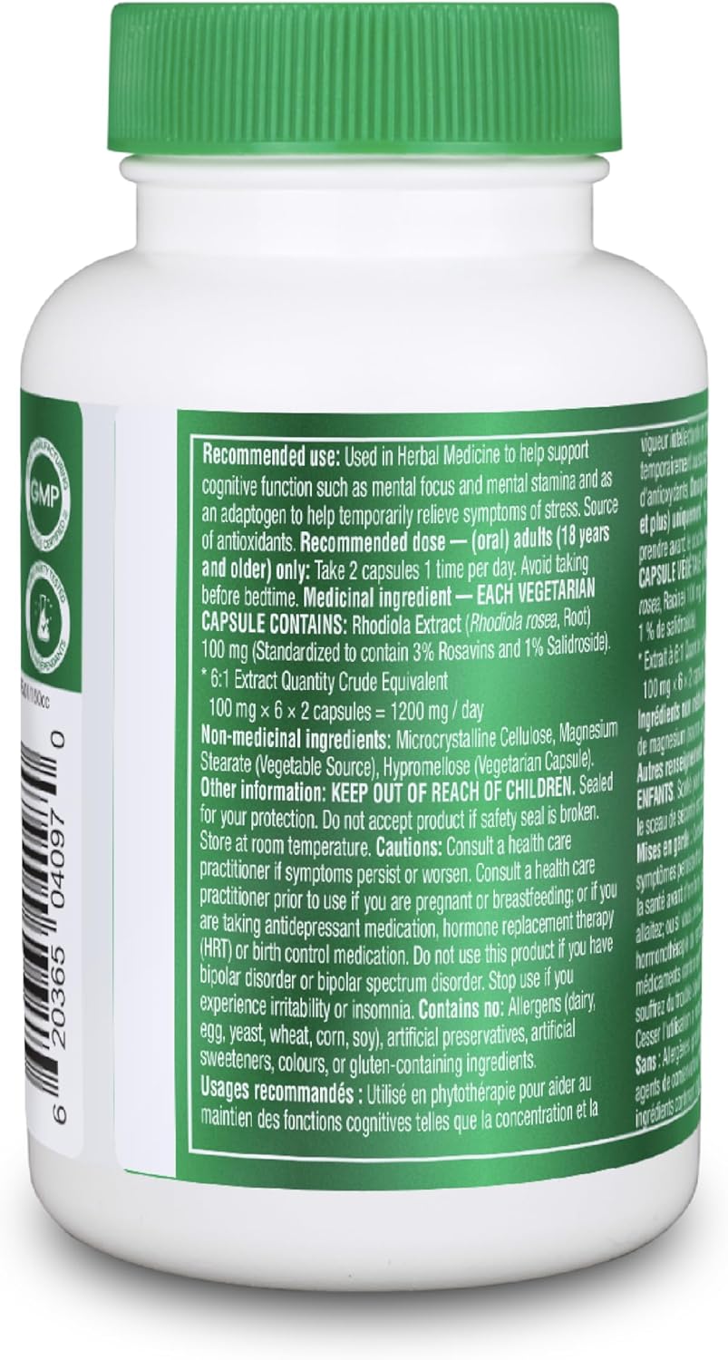 Organika 红景天提取物 100 毫克 - 3% 玫瑰果苷,1% 红景天苷 - 适应原,支持认知,集中精神应对压力 - 60 粒胶囊