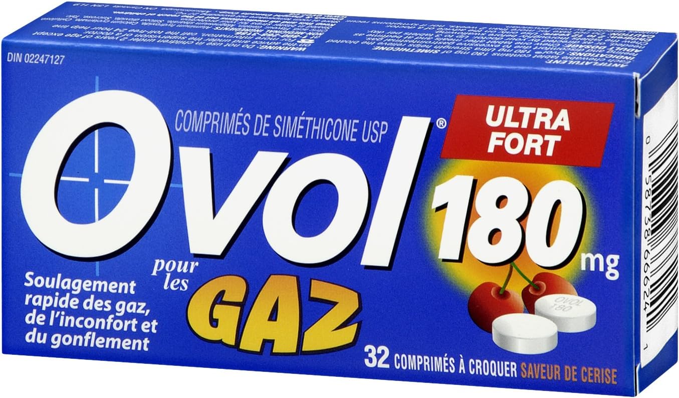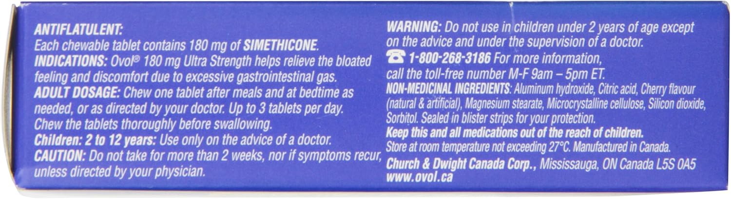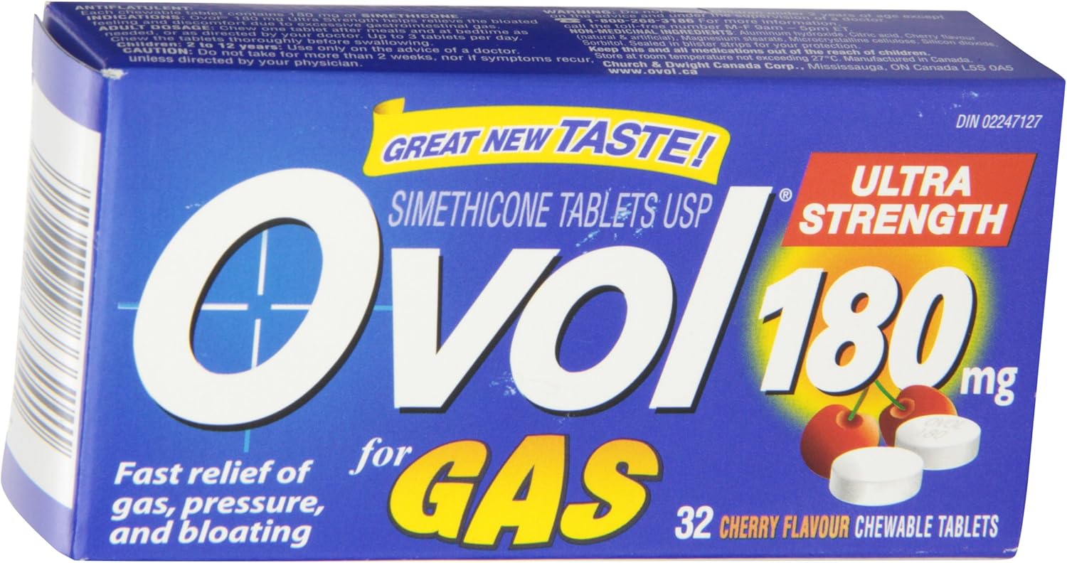 Ovol 强效樱桃味咀嚼片,缓解胀气疼痛、腹胀和腹胀,加拿大制造,180 毫克,32 片