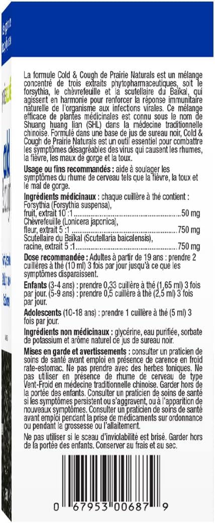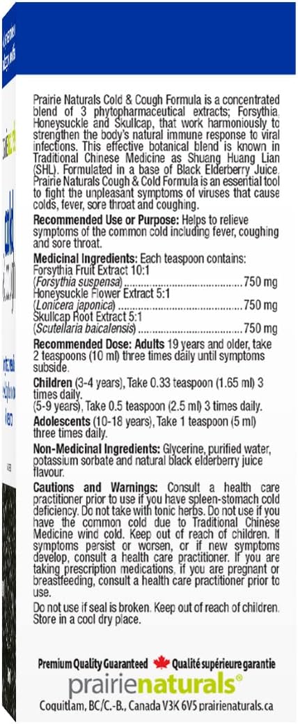 缓解咽喉痛、咳嗽和发烧。Prairie Naturals 感冒止咳配方浓缩了三种药用提取物:连翘、金银花和黄芩,它们协同作用,增强人体对病毒感染的天然免疫反应。Prairie Naturals 感冒止咳配方以黑接骨木果汁为基底,是对抗引起感冒、发烧、咽喉痛和咳嗽等不适症状的必备良方。经临床验证。