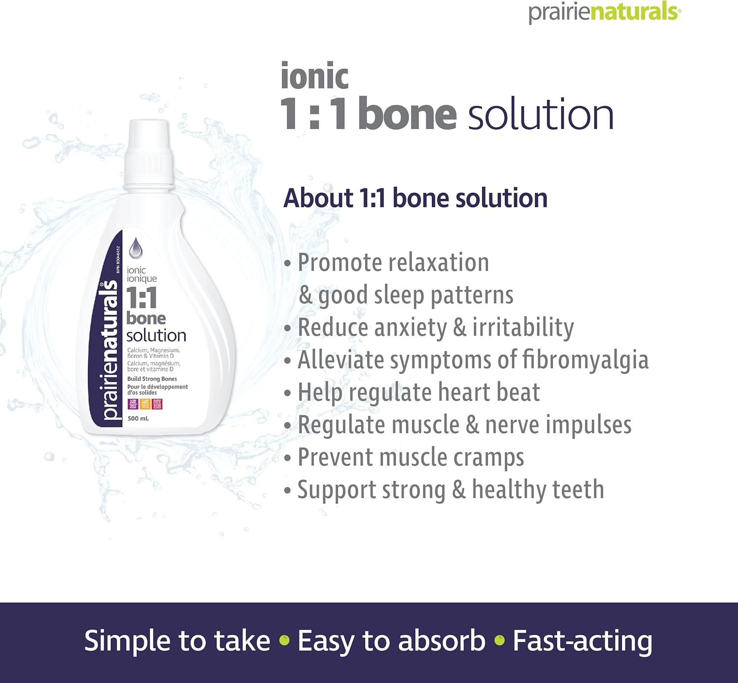 骨质疏松症?Prairie Naturals 1:1 骨溶液采用等比例液体钙和镁。它以科学配方混合了钙、镁和维生素D,可最大程度地促进吸收和利用。这些营养素与水分子结合,形成易于人体吸收的溶液,从而最大程度地发挥功效。1:1 骨溶液服用简便,易于吸收。它有助于预防骨吸收和骨质疏松症;调节肌肉和神经功能;促进放松和良好的睡眠习惯;缓解经前综合症、肌肉痉挛和腿抽筋;调节心跳。可轻松与水或您喜爱的果汁混合。不含苯甲酸钠。不含酵母。