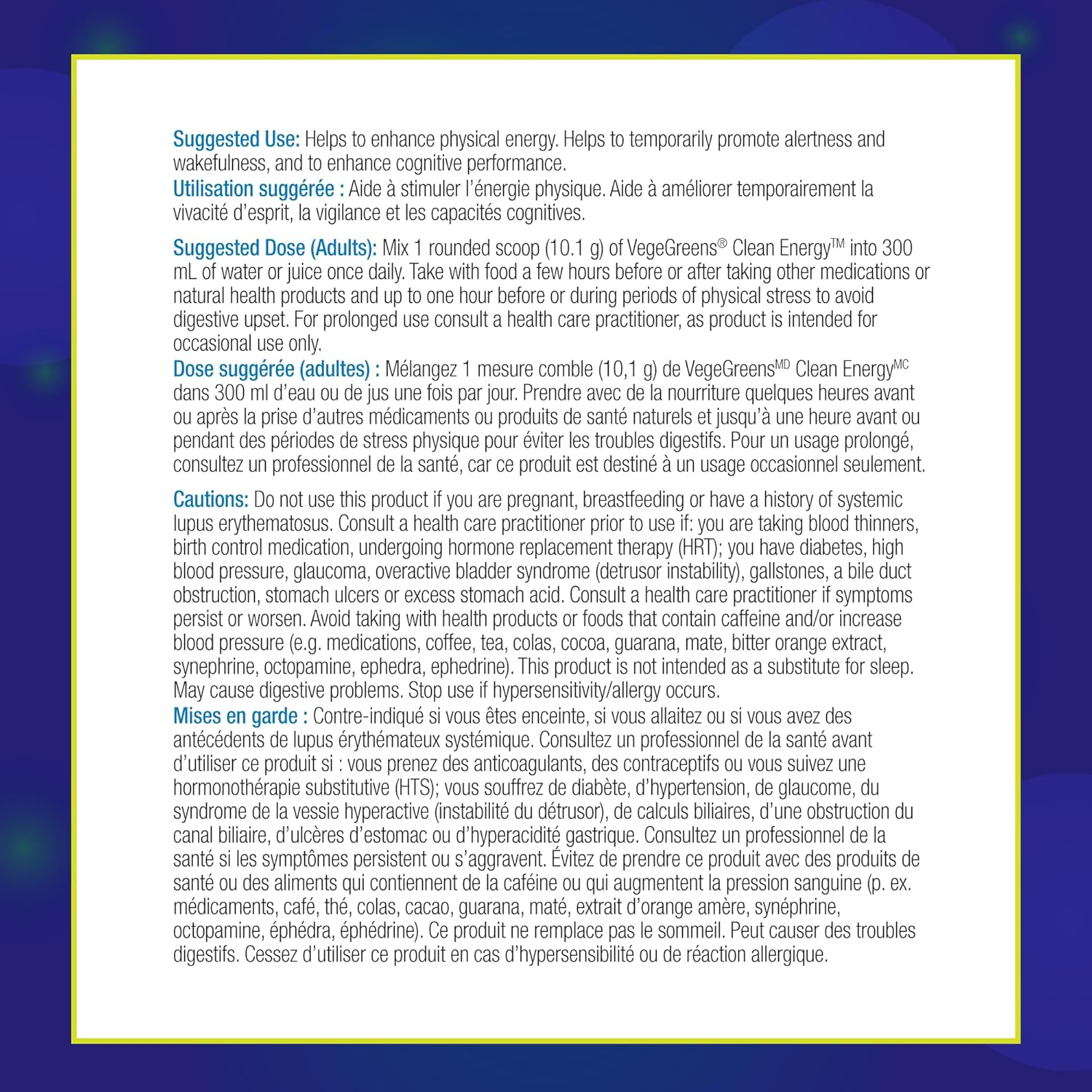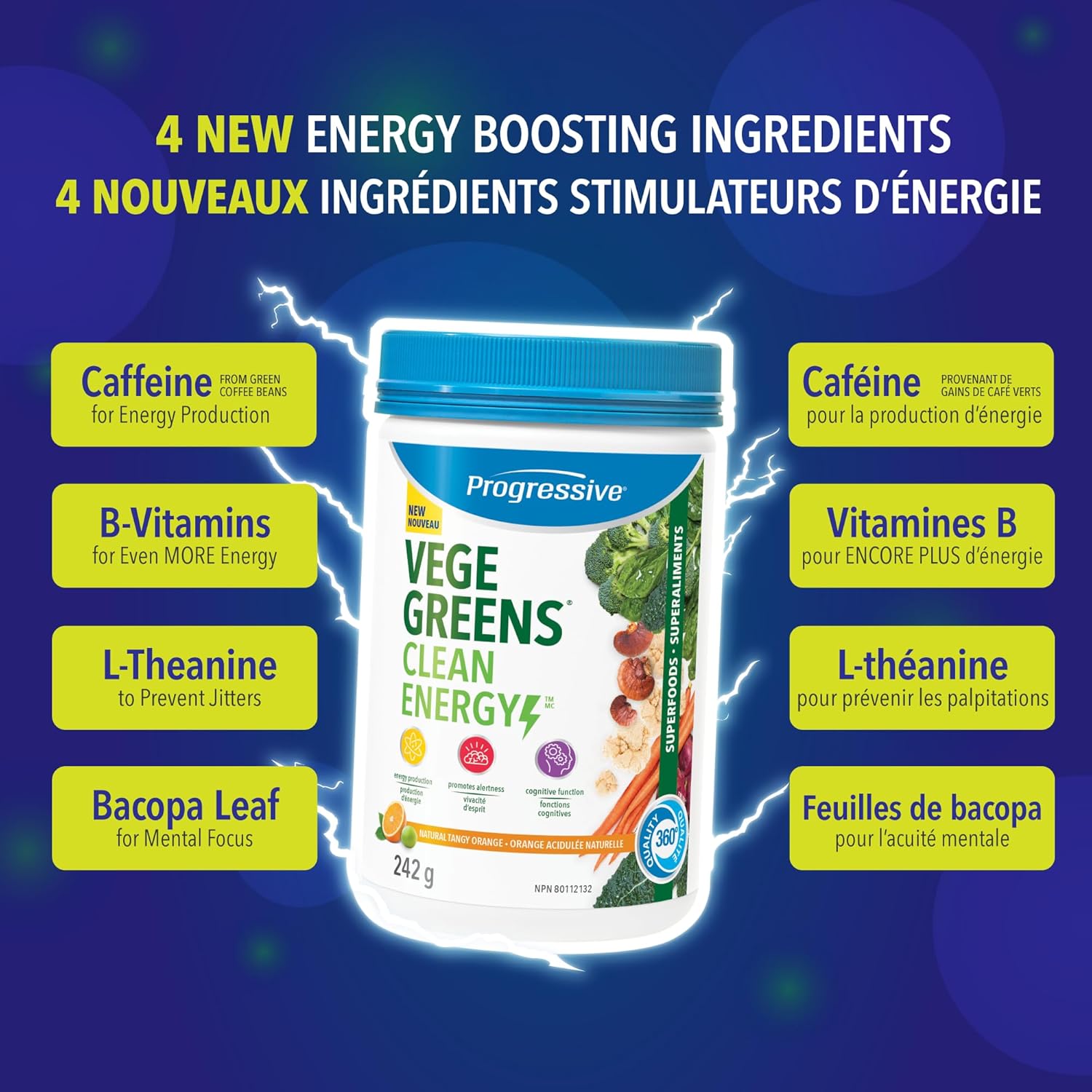 Progressive VegeGreens 清洁能量粉是一种便捷的补充膳食营养的方式,它能为您的日常饮食补充功能性能量超级食品。每一勺这款纯素超级食品粉都为您提供源自陆地和海洋蔬菜的真正食材。添加的清洁能量混合物包含B族维生素、L-茶氨酸、来自绿咖啡豆的天然咖啡因以及假马齿苋,可显著提升您的能量,同时避免您感到紧张不安。VegeGreens 清洁能量粉还能支持您的免疫系统和消化系统,并增强您身体的抗炎反应。这款天然能量配方富含酶混合物,可帮助您的身体更好地消化植物成分。每一勺还包含适应原蘑菇混合物以及姜黄、酸樱桃和接骨木莓等功能性植物成分。
