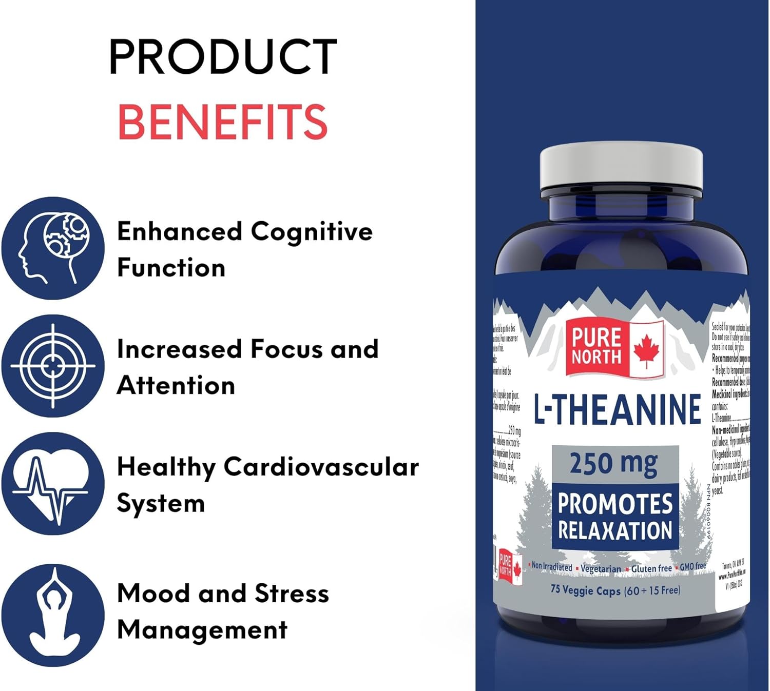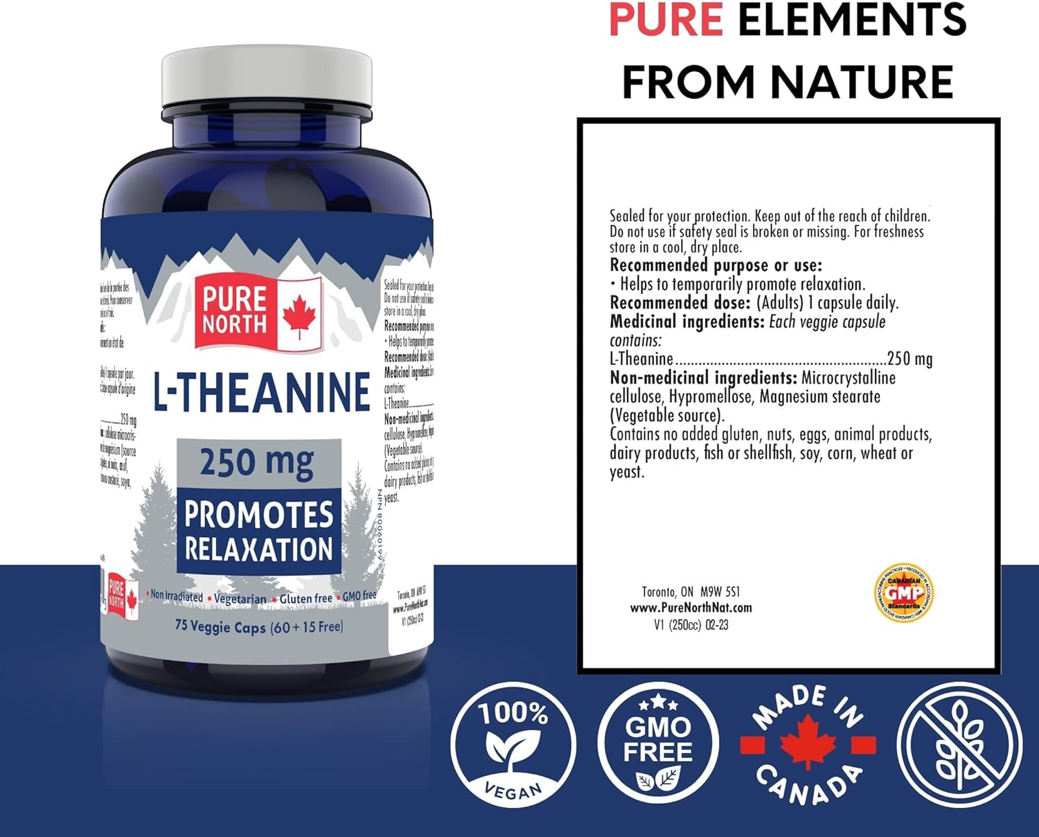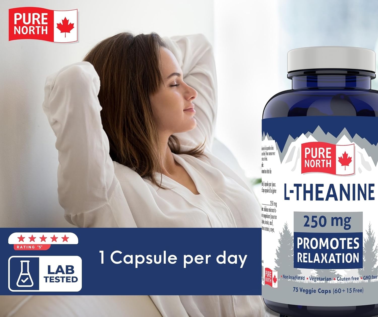 PURE NORTH NATURALS L-茶氨酸 250 毫克,75 粒素食胶囊,75 天用量 - 纯素、非转基因、无麸质,促进放松,增强认知功能 - 加拿大制造