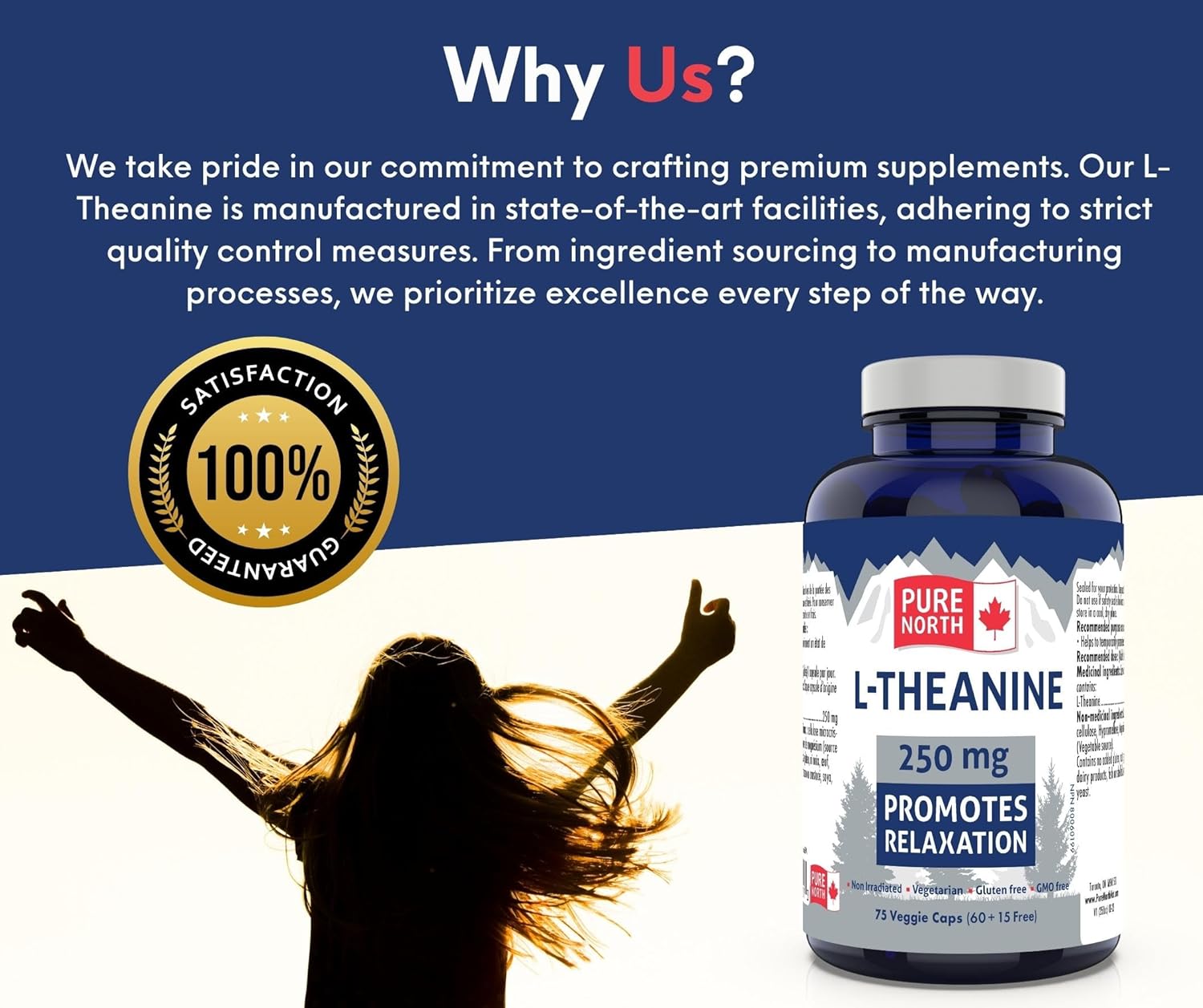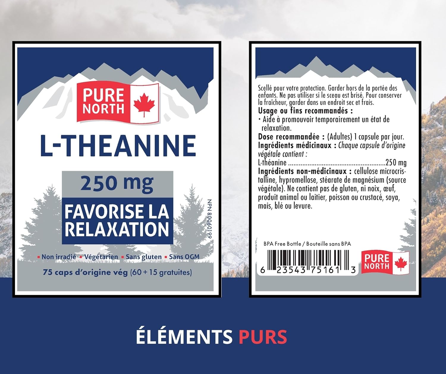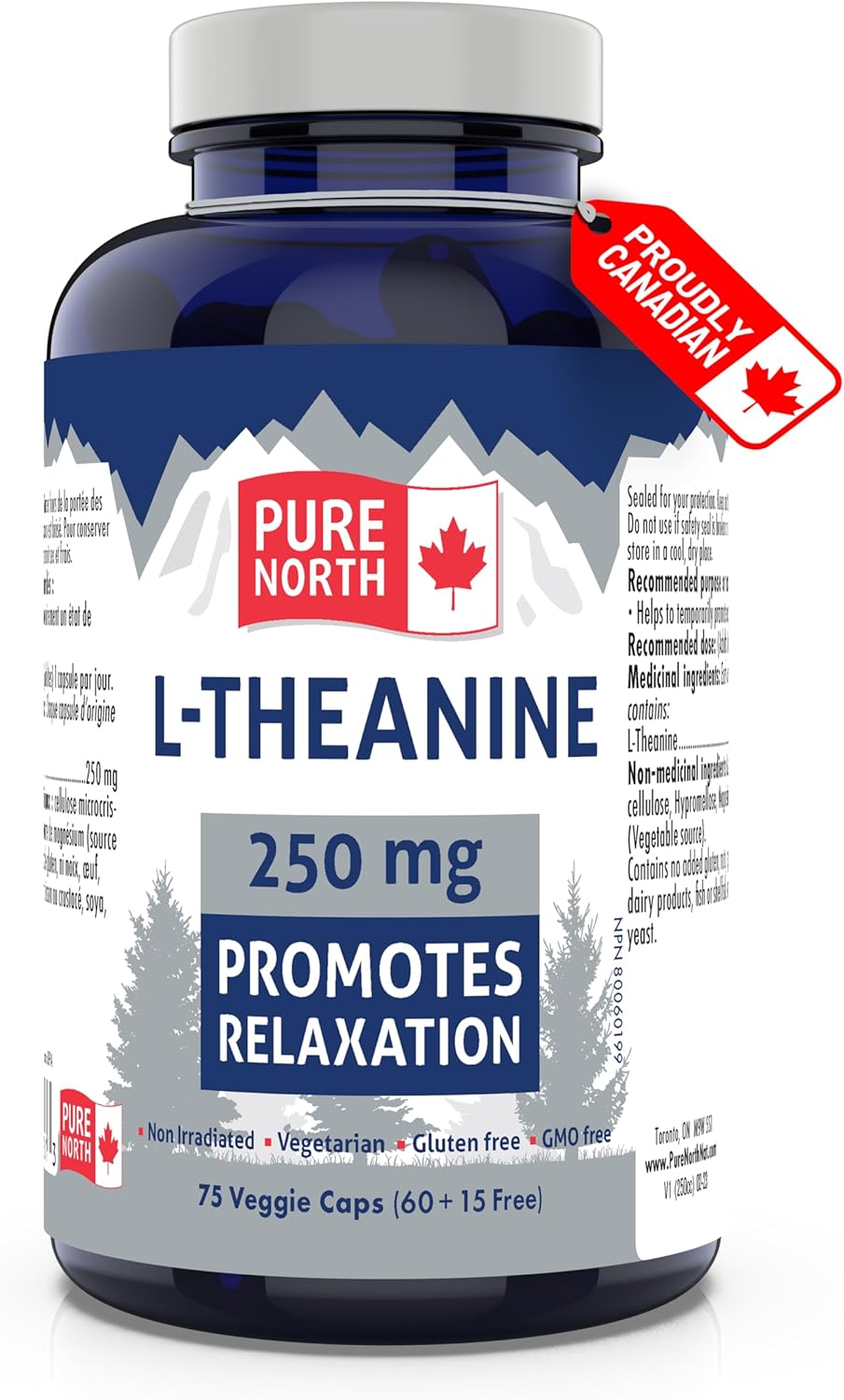 PURE NORTH NATURALS L-茶氨酸 250 毫克,75 粒素食胶囊,75 天用量 - 纯素、非转基因、无麸质,促进放松,增强认知功能 - 加拿大制造