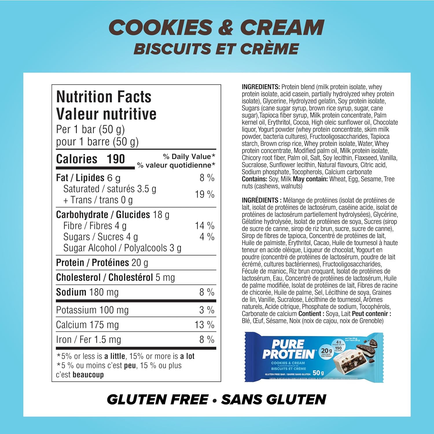 纯蛋白棒 - 营养丰富,无麸质,采用乳清蛋白混合物制成 - 低糖,蛋白质零食。美味满足。加拿大制造,曲奇奶油味(6包)