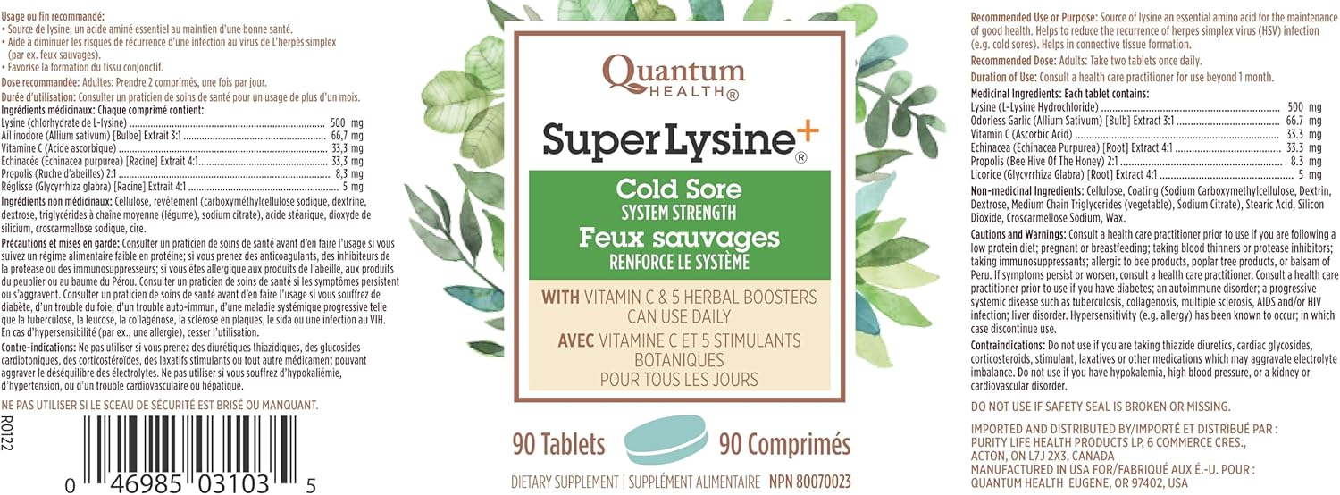L-赖氨酸——我们的特色成分,通过影响精氨酸活性来促进口腔健康。维生素C——值得信赖的全效维生素,长期以来被认为能够支持健康的免疫反应。蒜头(除臭)——在免疫系统受到挑战时依赖的传统植物成分。SuperLysine+片剂仅可在免疫系统受到挑战时使用。然而,此配方非常适合日常使用——特定的紫锥菊和甘草配方和剂量可以每天服用。帮助身体吸收钙、铁和锌。制造商:Quantum Super Lysine+。营业地点:Concord, ON L4K 2R5, CA。商品型号:PURITY-735320。产品尺寸:5.08 x 20.32 x 5.08 厘米;100 克。ASIN:B00CP7S1QG。畅销商品排名:健康与个人护理类排名第4,583位(查看健康与个人护理类排名前100位),感冒和流感药品类排名第7位。已停产厂商:否。首次上市日期:2013年5月8日。原产国:美国。顾客评价:4.6 4.6星(满分5星),194条评价。