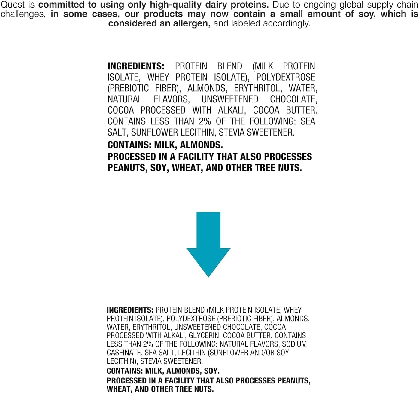全天然Quest蛋白棒,美味双倍巧克力口味。它富含纤维和蛋白质,是您下午提神或运动前的理想之选。Quest是市面上唯一真正的低碳水化合物蛋白棒,美味可口,无负担。由于全球供应链问题,Quest™最近调整了部分产品的配方,添加了包括大豆油在内的植物油,大豆油被认为是过敏原。产品中少量的植物油不会影响产品的品质、风味和口感。我们始终致力于使用高品质的乳蛋白,为您提供所需的氨基酸。