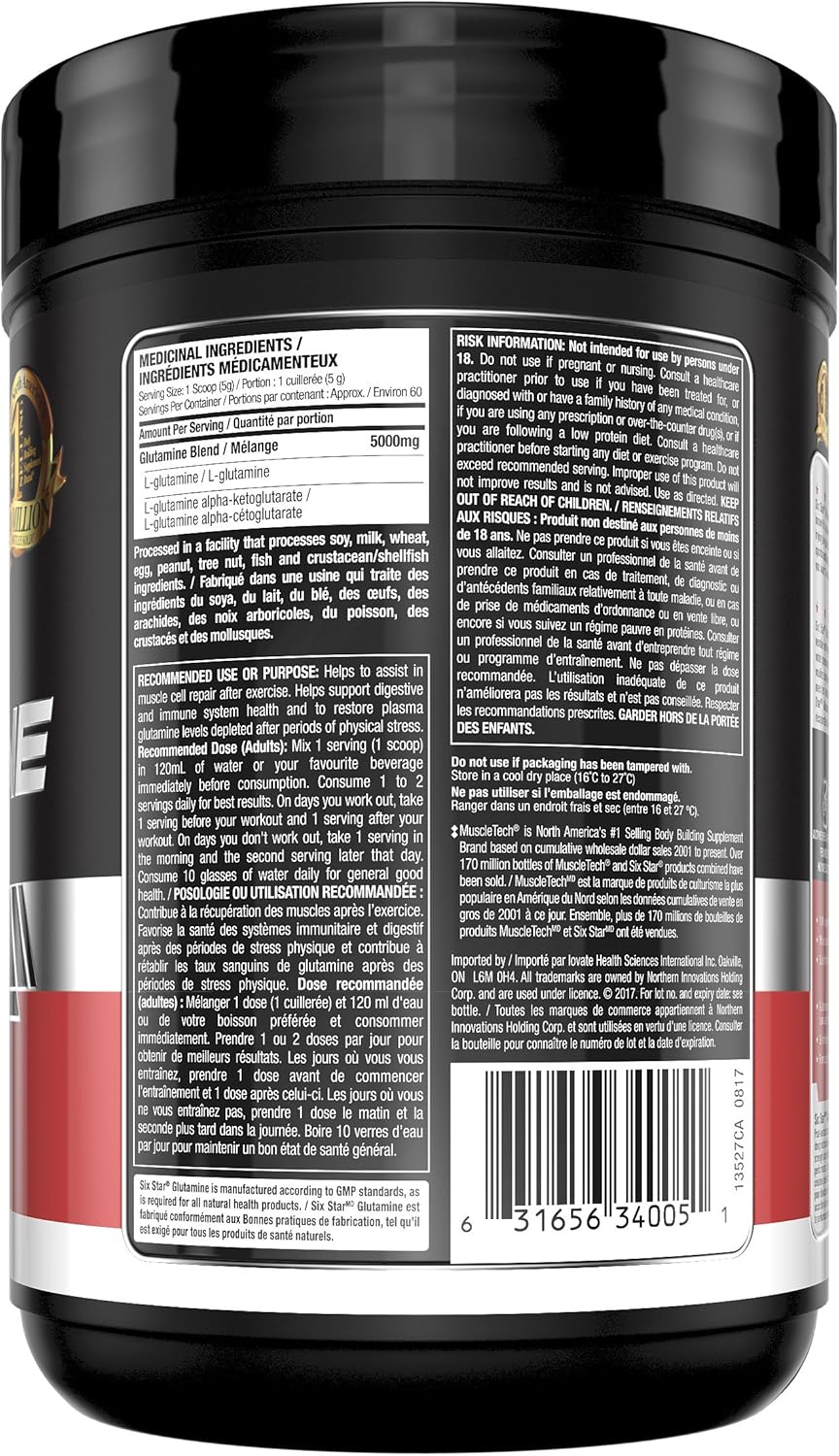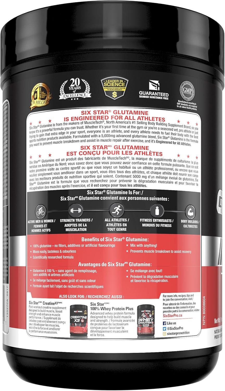 Six Star Pro Nutrition 谷氨酰胺氨基酸粉。它是一种条件性必需氨基酸,人体可能无法自行合成以满足其极端需求。每剂超浓缩谷氨酰胺含有 5000 毫克高级谷氨酰胺混合物。它有助于恢复高强度训练后可能消耗的血浆谷氨酰胺水平。其强效配方有助于支持健康的免疫系统。它还能防止肌肉分解,促进运动后肌肉恢复。