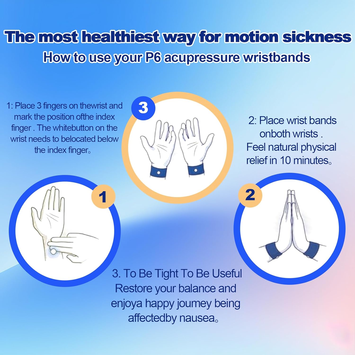 【减轻恶心】:腕带可缓解恶心,让您再次享受旅行。它非常适合减轻孕吐、晕船、晕车、晕机和任何其他旅行病。【使用频率】:可连续反复使用。不会引起嗜睡或其他副作用。【使用方法】:恶心腕带通过用特殊塑料球按压特殊穴位来达到平衡,双手同时佩戴效果更佳。【商品尺寸】:5x3cm,加固后为5.5英寸。柔软的棉质材料和强力的弹性设计,适合儿童舒适穿着。颜色:蓝色和红色。【健康有效】:缓解晕动病的最健康方法,无需药物,无副作用。简单、安全和自然的穴位按压技术经证实有效。