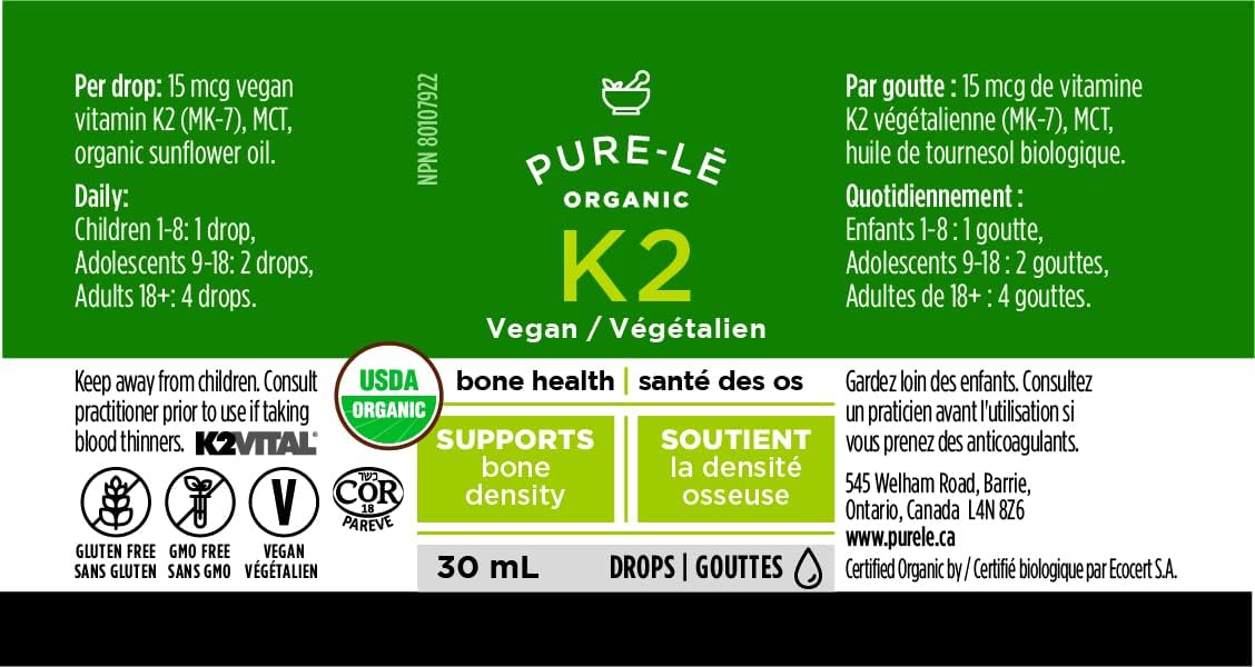 Pure-lē Organic 纯素维生素 K2 蕴含获得专利的不含大豆的 K2Vital 甲萘醌-7 (MK-7) 维生素 K2 的强大功效,经临床验证,该成分具有高生物利用度和稳定性。