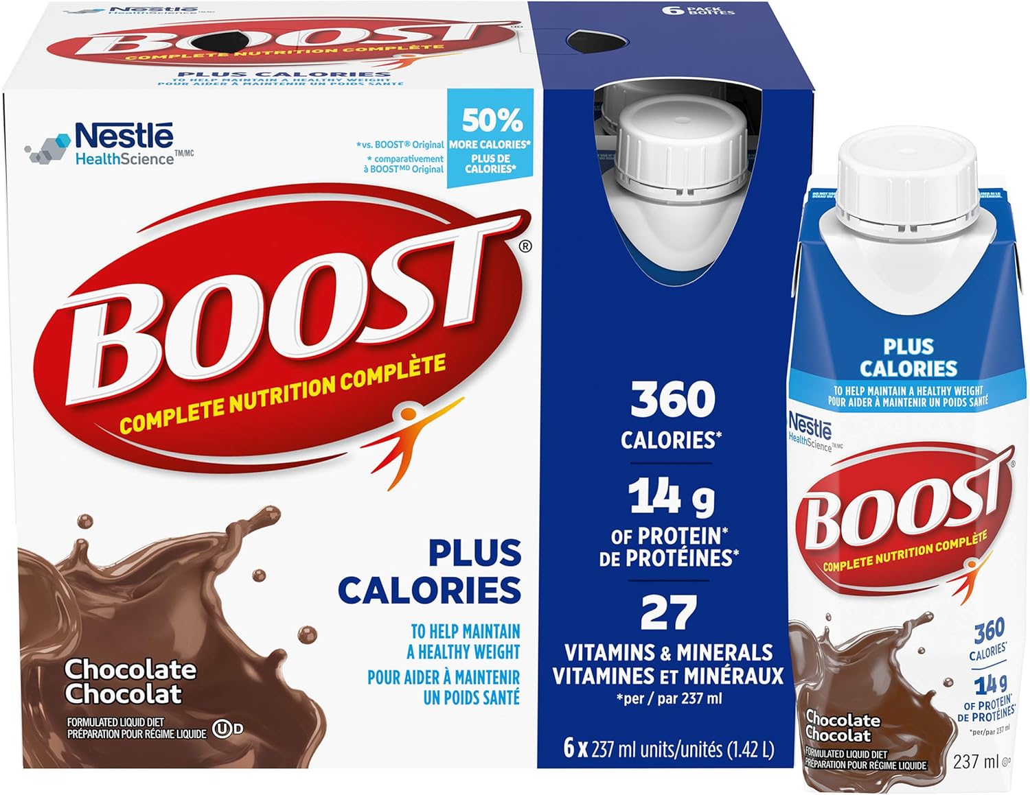 BOOST 糖尿病营养补充剂,巧克力味,6x237 毫升,每箱 4 瓶,包装可能有所不同 & PLUS 全营养饮料,巧克力味,6x237 毫升,每箱 4 瓶,包装可能有所不同