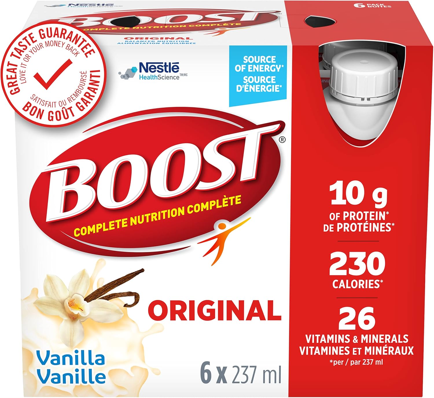 BOOST PLUS 全营养饮料,草莓味,24 x 237 毫升 BOOST PLUS 全营养饮料 - 草莓味(6 x 237 毫升)是一种配方流质膳食,可提供全营养,专为寻求保持或增加健康体重的人士设计。每份 237 毫升含有 360 卡路里、27 种维生素和矿物质以及 14 克蛋白质。此外,我们的配方保证您一定会爱上它美味的口感。其他口味包括巧克力和香草。仅供口服。请遵医嘱服用。BOOST Original 代餐饮料,香草味,24 x 237 毫升 - 包装可能有所不同 BOOST Original 是一款方便的代餐饮料,非常适合您在旅途中或日常饮食不足时饮用。 BOOST 原味全营养代餐饮料 - 香草味(6 x 237毫升)每237毫升饮料含有26种必需维生素和矿物质、10克蛋白质和230卡路里,提供能量和均衡的营养,完美契合任何生活方式。此外,我们的配方不含人工香料或色素,采用天然甜味剂,带来您爱不释手的美味。