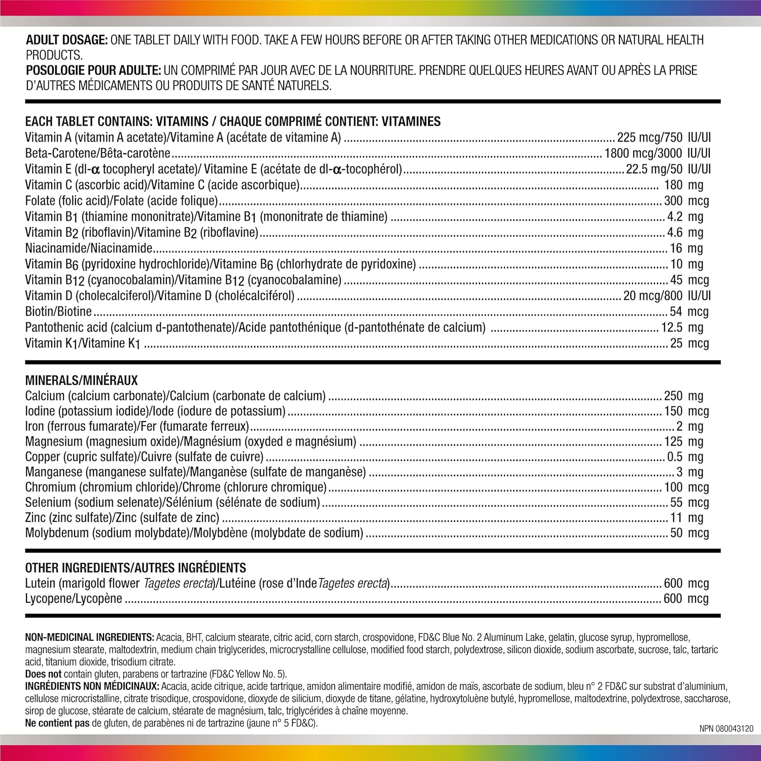 Centrum 男士复合维生素专为 50 岁以上男性配制,富含抗氧化剂硒以及锌、镁和 B 族维生素,可满足成年男性的营养需求。Centrum 男士 50+ 复合维生素有助于增强免疫系统,维持视力和肌肉功能,并维持身体代谢营养物质的能力。Centrum 男士 50+ 复合维生素经验证不含转基因成分和麸质,其维生素和矿物质配方可从内部滋养您的身体,从而支持身体健康。凭借超过 35 年的营养科学专业知识,Centrum 是医生推荐的复合维生素第一品牌*,也是加拿大销量第一的复合维生素品牌**。本包装包含一瓶 90 片装的 Centrum 男士复合维生素/矿物质补充剂片剂。 (*基于 2020 年 3 月的 IMS Health 数据;**Centrum 计算部分基于尼尔森通过其市场跟踪服务报告的截至 2020 年 10 月 31 日的 52 周期间成人维生素类别的数据)