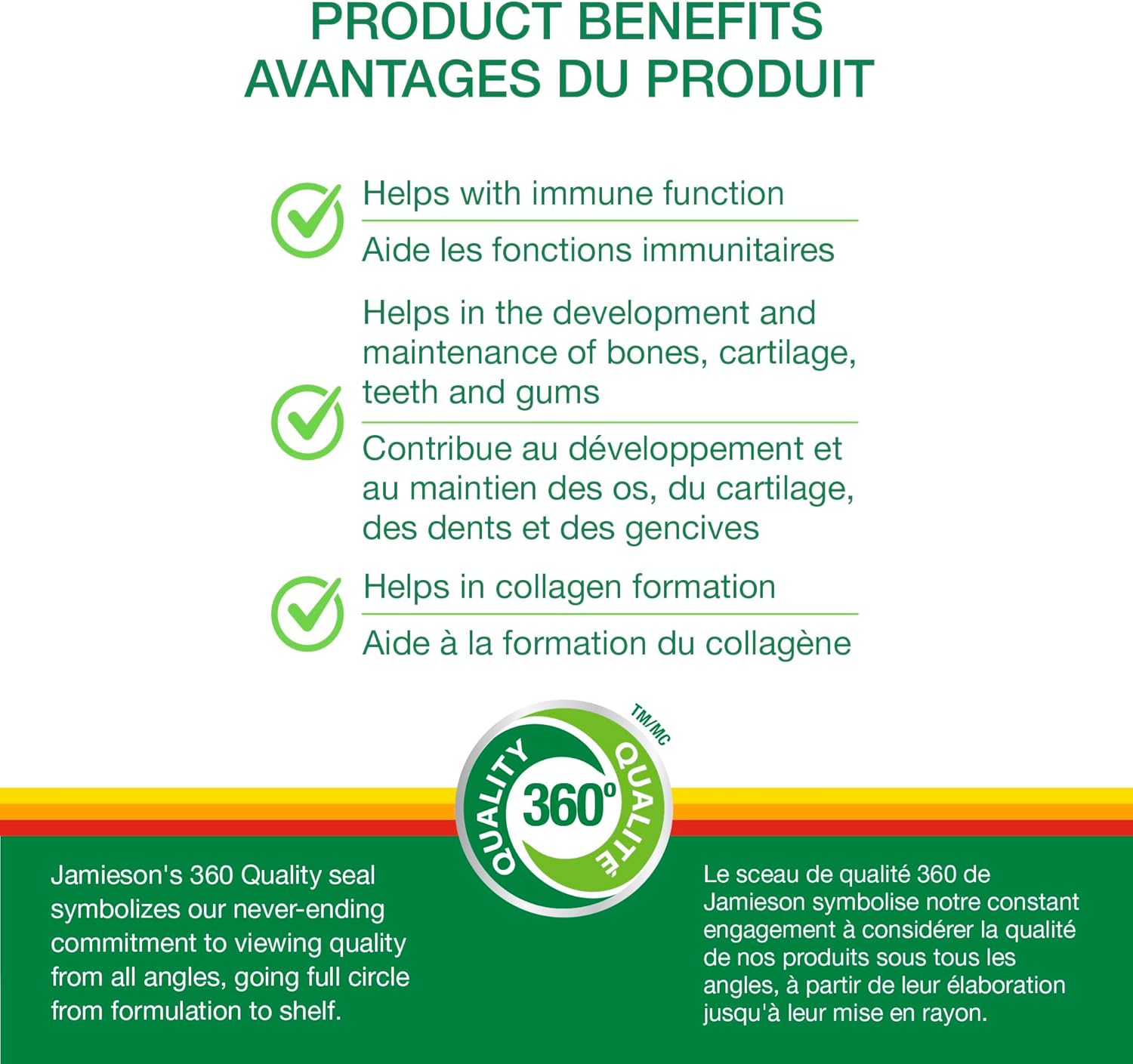 咀嚼片维生素D3 1,000 IU - 热带水果口味,100片(1包)Jamieson 维生素D3咀嚼片每片含1,000 IU维生素D3。维生素D3支持免疫健康,同时也在维持身体健康方面发挥着关键作用。维生素D还有助于促进骨骼健康发育和钙的有效吸收。这些美味的咀嚼片不添加色素或香精,是补充维生素D3的有趣又美味的方式。Jamieson Laboratories 维生素C咀嚼片500毫克,混合三种口味,120片Jamieson 维生素C咀嚼片500毫克——混合三种口味(樱桃味、橙子味和热带水果味)是一种强大的抗氧化剂。它具有多种益处,从增强免疫系统到促进毛细血管、牙齿和牙龈健康,以及帮助铁的吸收。