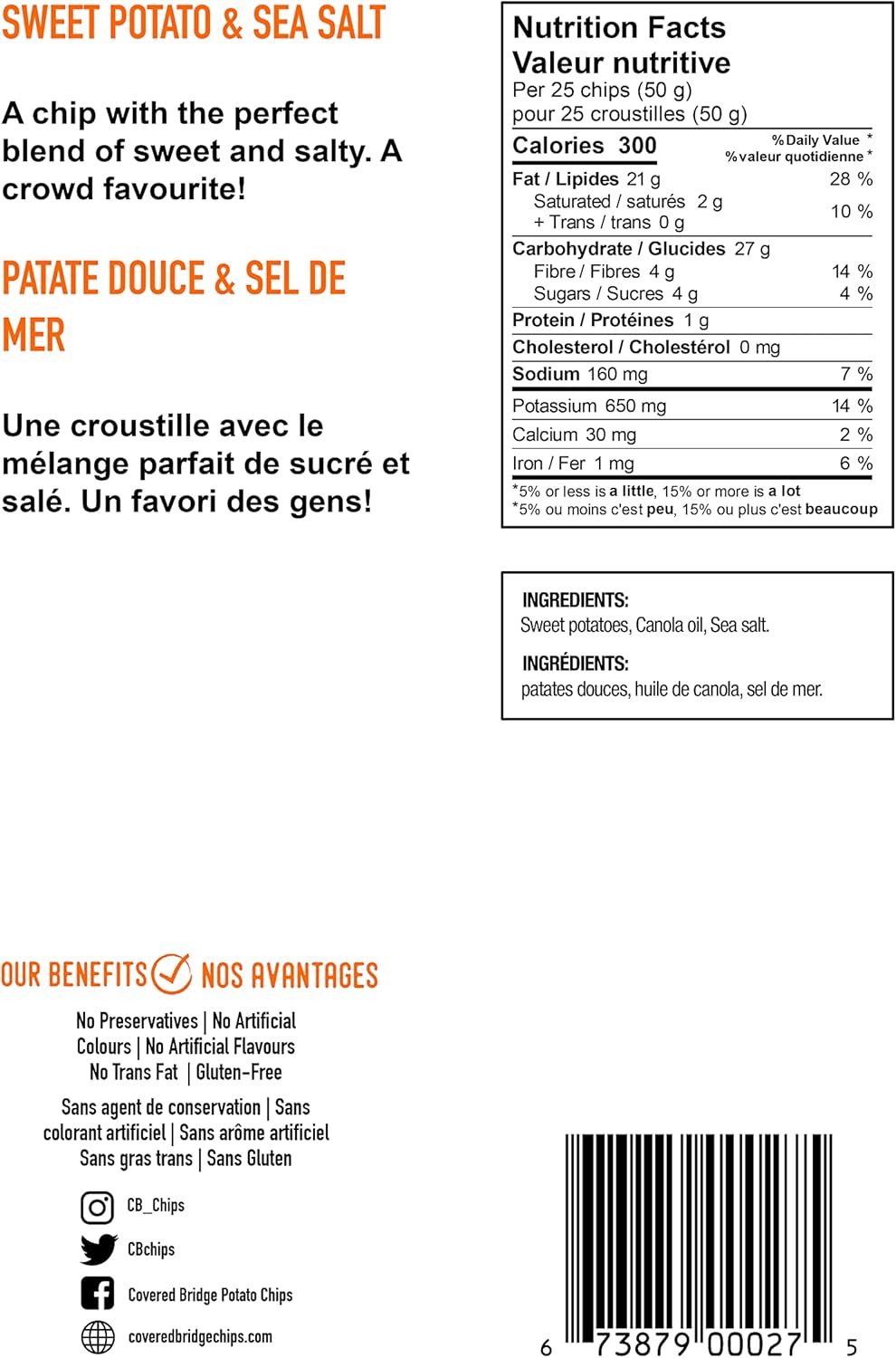 Covered Bridge Chips 薯片 - 红薯和海盐薯片 - 无麸质,犹太洁食认证,红薯水壶烹制,加拿大制造,12 片装,每袋 142 克