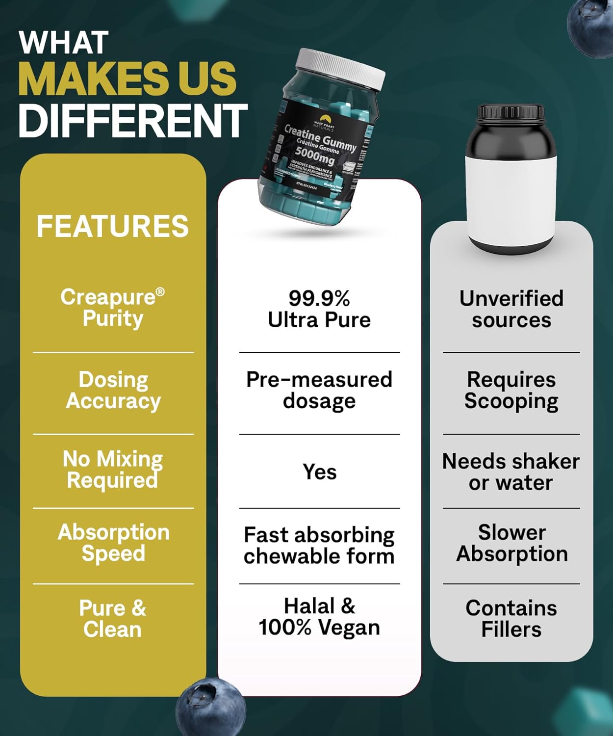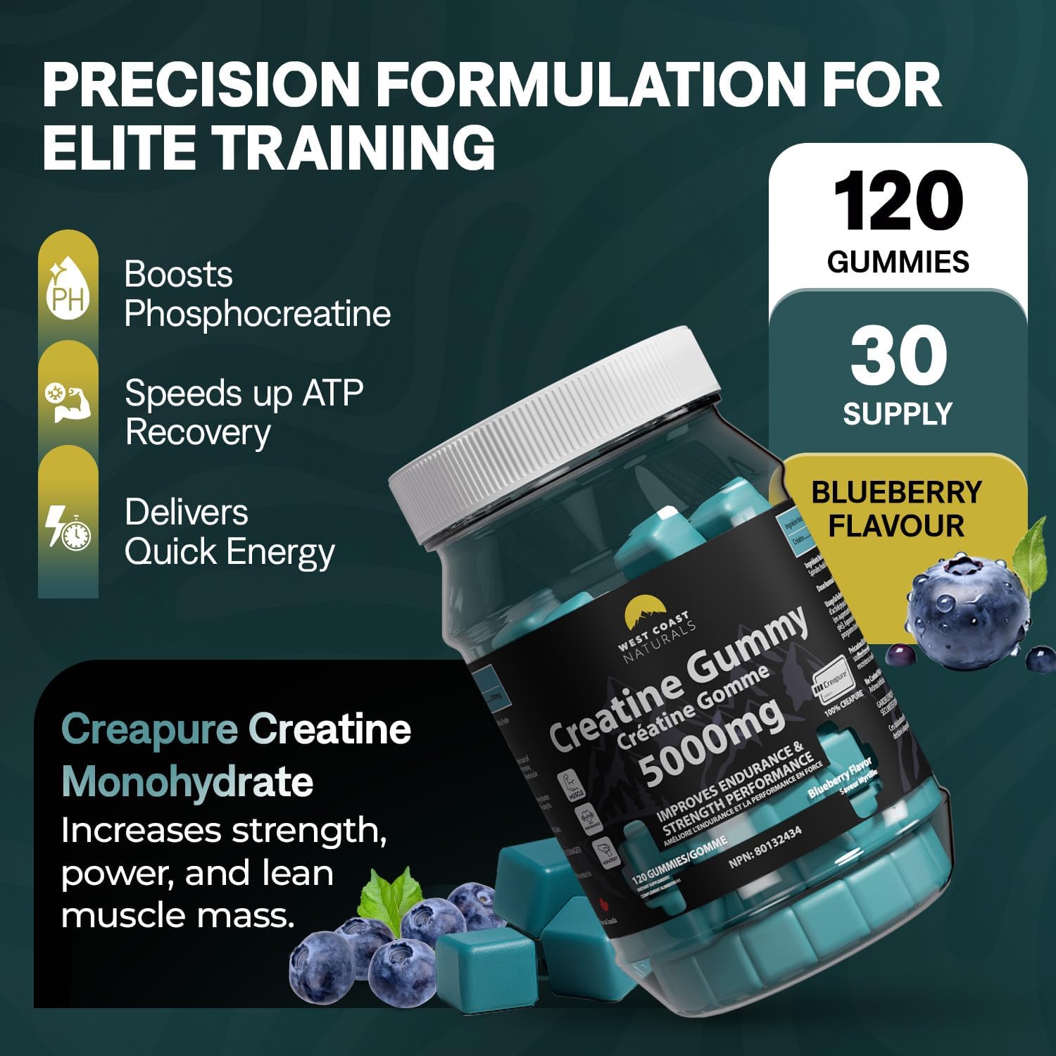 West Coast Naturals 肌酸一水合物软糖 5000 毫克 - 蓝莓味,无添加糖,男女适用咀嚼补充剂,纯素 - 犹太洁食认证 - 120 粒