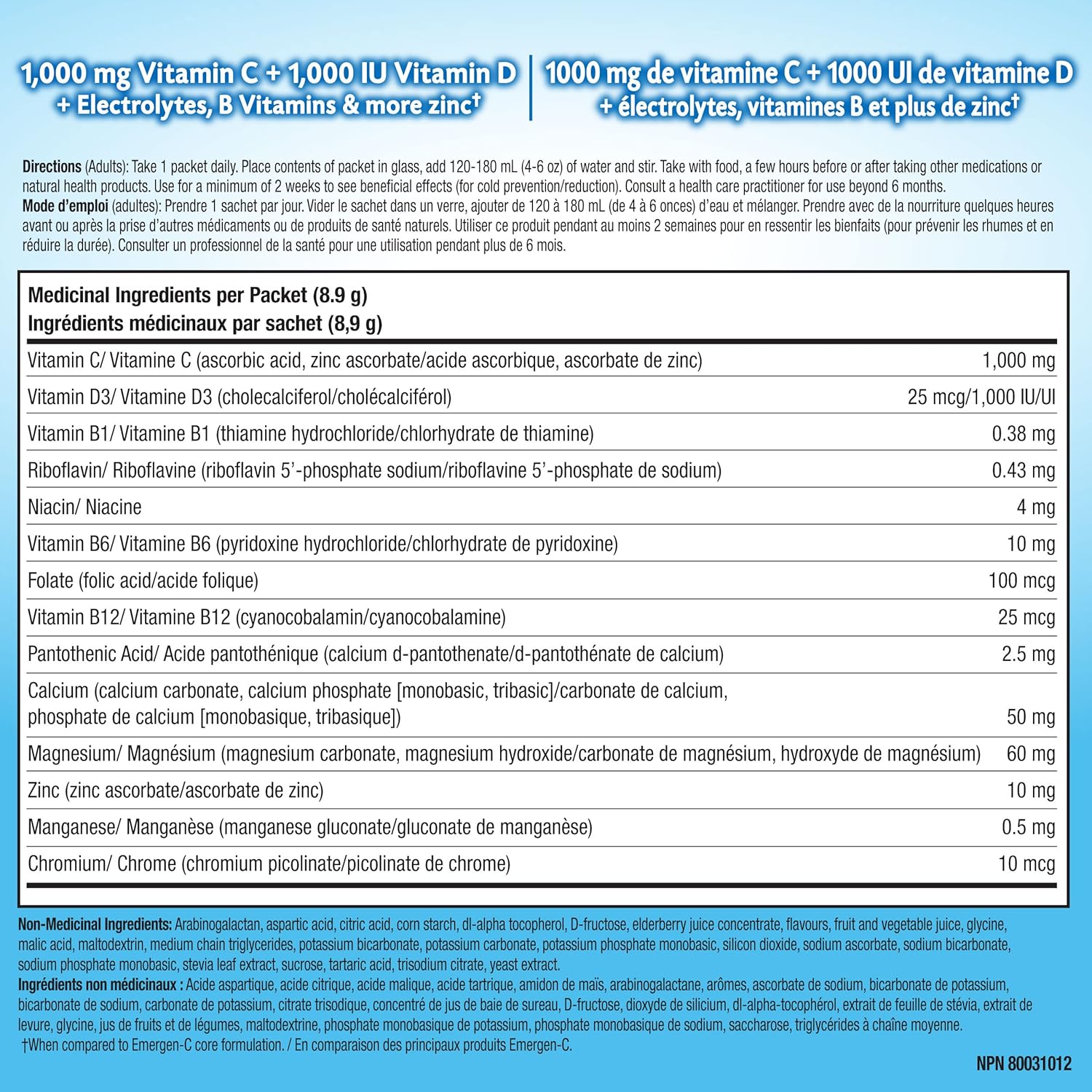 Emergen-C 1000mg 维生素 C 粉补充剂,含电解质的饮料混合物,免疫系统助推器,超级橙子,30 包适合全年使用,Emergen-C 富含维生素、抗氧化剂和电解质,有助于支持您在家中、办公室或旅途中的免疫健康。每剂提供 1,000 毫克维生素 C,比 10 个橙子的维生素 C 还多(基于加拿大卫生部的常见食物营养价值,橙子)。Emergen-C 是维持免疫功能和帮助支持能量产生的理想选择,它包含七种 B 族维生素和其他电解质,可在锻炼后补充身体所需。Emergen-C 不含咖啡因,采用天然香料制成,使用方便 - 只需将 Emergen-C 饮料混合粉溶于冷或温水(4 至 6 盎司)中,看着它冒泡,混合,然后享用。此包装包括 30 个独立份量的 Emergen-C 超级橙味饮料混合物。Emergen-C 维生素 C 粉补充剂,含电解质的饮料混合物,免疫增强,接骨木味,18 包Emergen-C 适合全年使用,它富含维生素、抗氧化剂和电解质,有助于支持您在家中、办公室或旅途中的免疫健康。每剂提供 1,000 毫克维生素 C,比 10 个橙子的维生素 C 还多(基于加拿大卫生部的常见食物营养价值,橙子)。Emergen-C 是维持免疫功能和帮助支持能量产生的理想选择,它包含七种 B 族维生素和其他电解质,可在锻炼后补充身体所需。Emergen-C 不含咖啡因,采用天然香料制成,使用方便 - 只需将 Emergen-C 饮料混合粉溶于冷或温水(4 至 6 盎司)中,看着它冒泡、混合,然后享用即可。