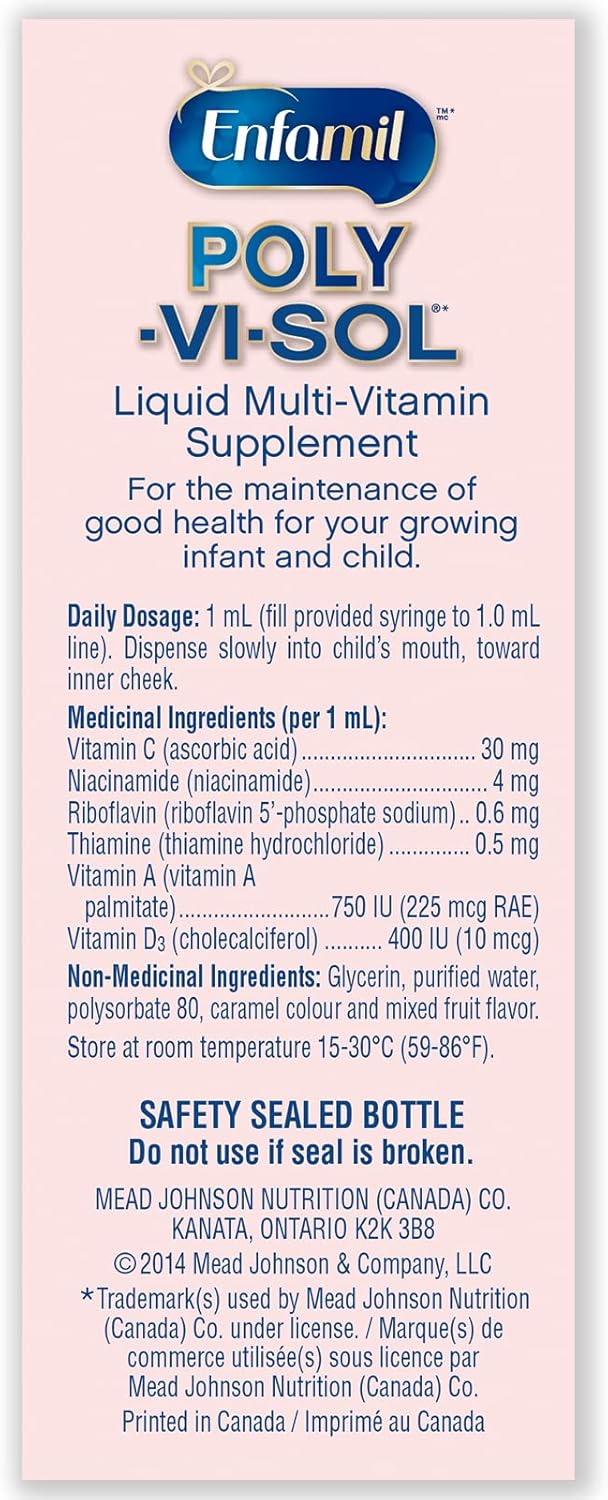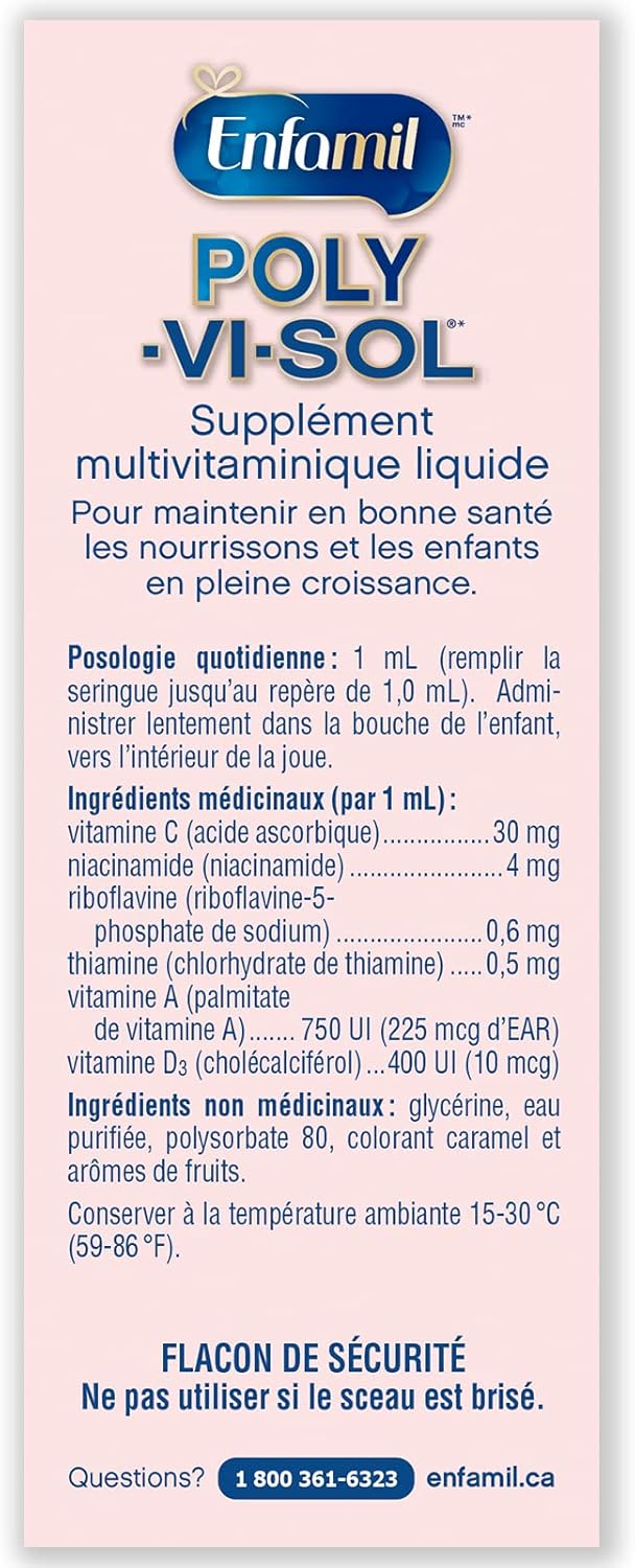 Enfamil Poly-Vi-Sol 是一款适合幼儿的复合维生素补充剂,含有维生素 D(400 国际单位),以及维生素 A、C、硫胺素(维生素 B1)、核黄素(维生素 B2)和烟酰胺(维生素 B3),有助于支持宝宝正在发育的免疫系统。请咨询您的医生,哪种 Enfamil 维生素补充剂适合您的宝宝。