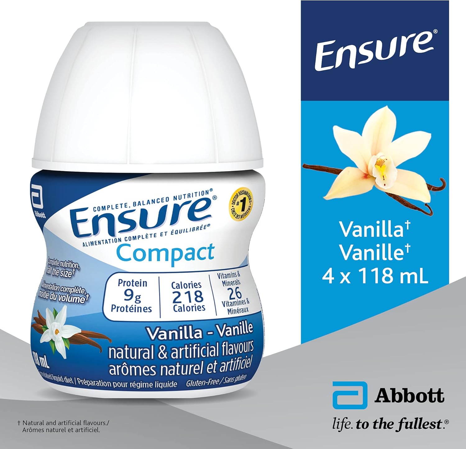 Ensure Compact Vanilla 香草味浓缩果汁仅需一半大小†,即可为无法食用完整份量的人士提供全面均衡的营养。每瓶含 9 克蛋白质以及 26 种维生素和矿物质。Ensure Compact 不含麸质,适合乳糖不耐症患者,并采用方便密封的瓶身设计。† 与 235 毫升 Ensure Regular 相比。