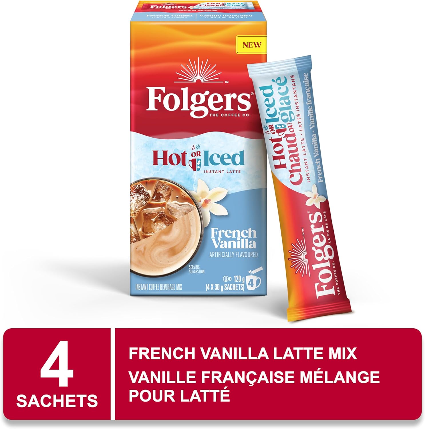 Folgers 速溶咖啡包,适用于热饮或冷饮混合饮料,速溶法式香草拿铁,4 个(1 包)