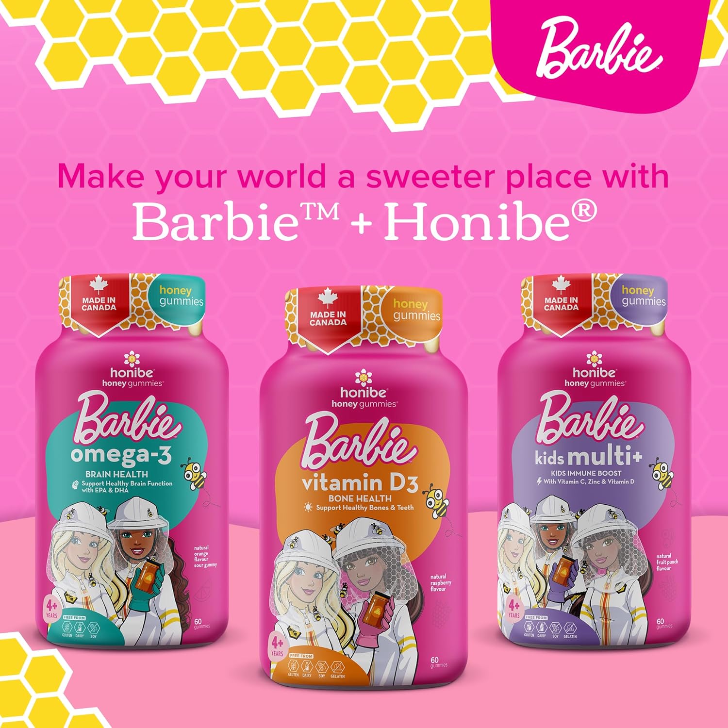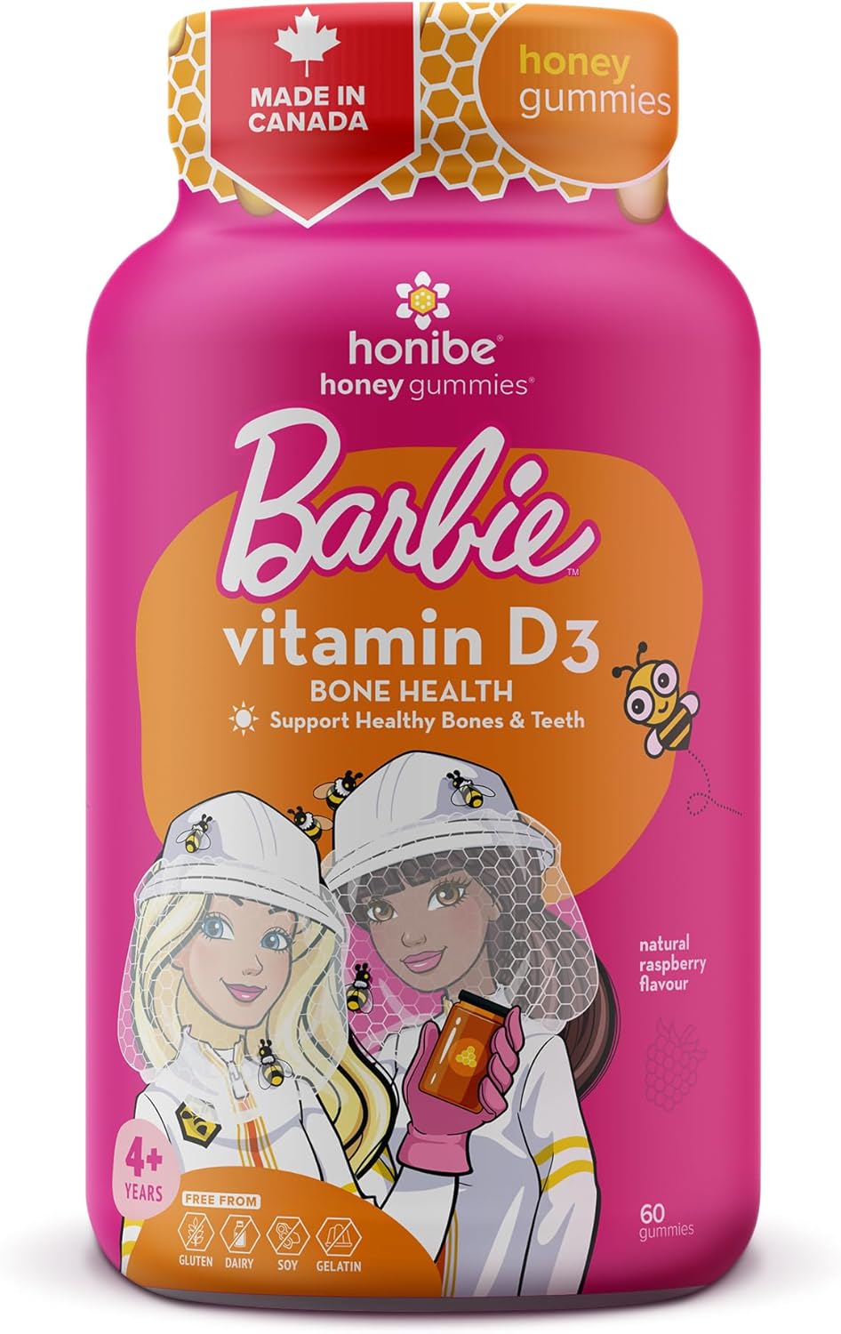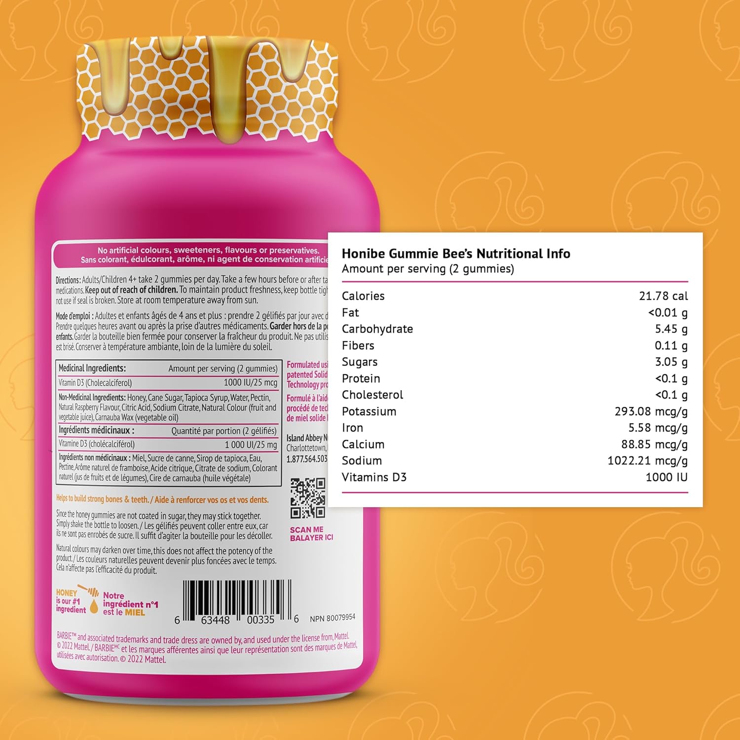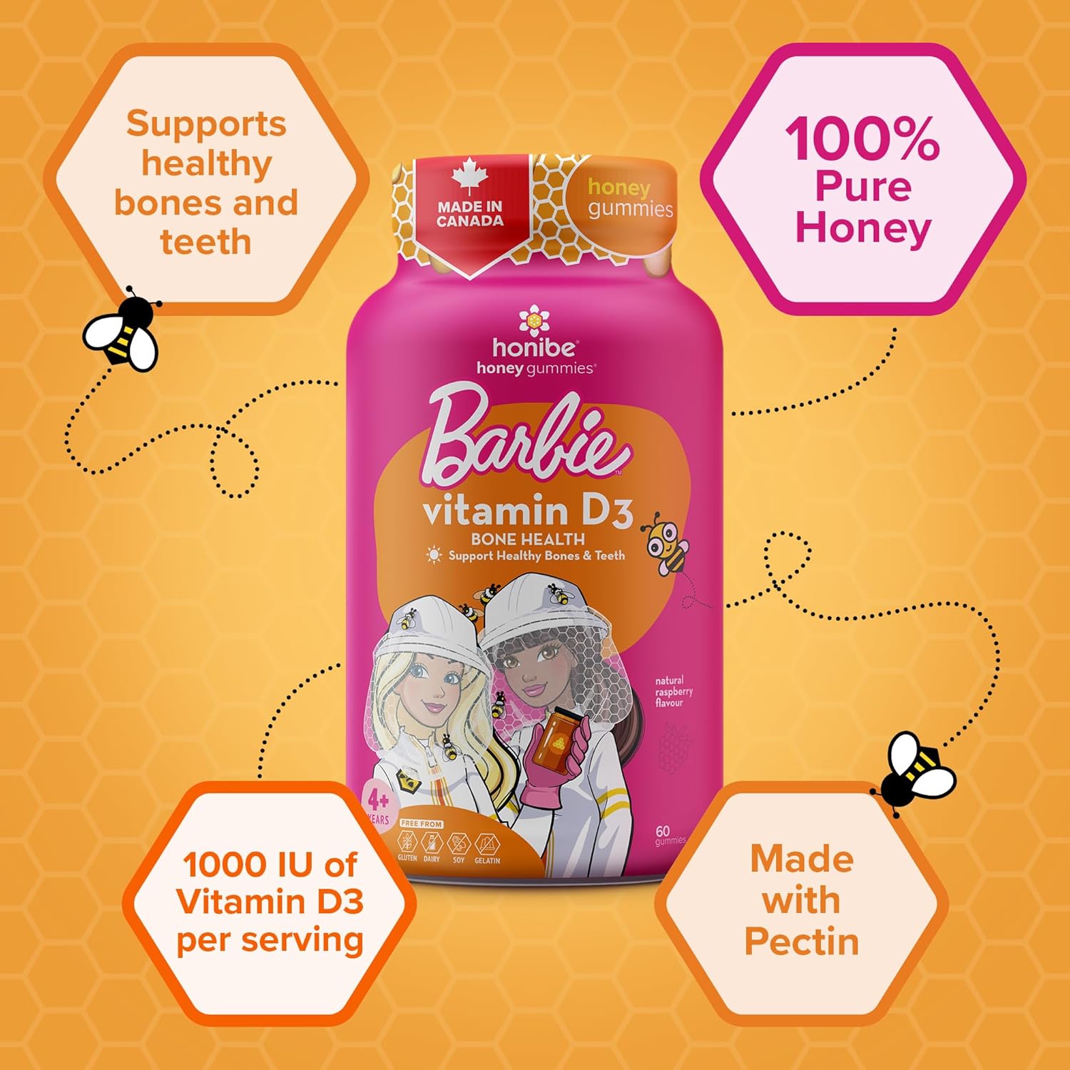 Honibe 维生素 D 软糖,适合儿童和成人,芭比,加拿大制造的蜂蜜维生素,维生素 D3 有助于支持骨骼健康、情绪和免疫系统功能,60 粒软糖