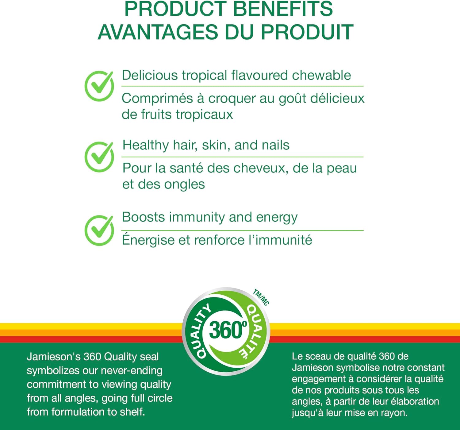 Jamieson 100% 成人复合维生素咀嚼片,轻松满足您每日所需的 100% 维生素。Jamieson 100% 复合维生素咀嚼片符合加拿大卫生部推荐配方,口感美味,融合了全天然热带水果和清爽柑橘的芬芳。