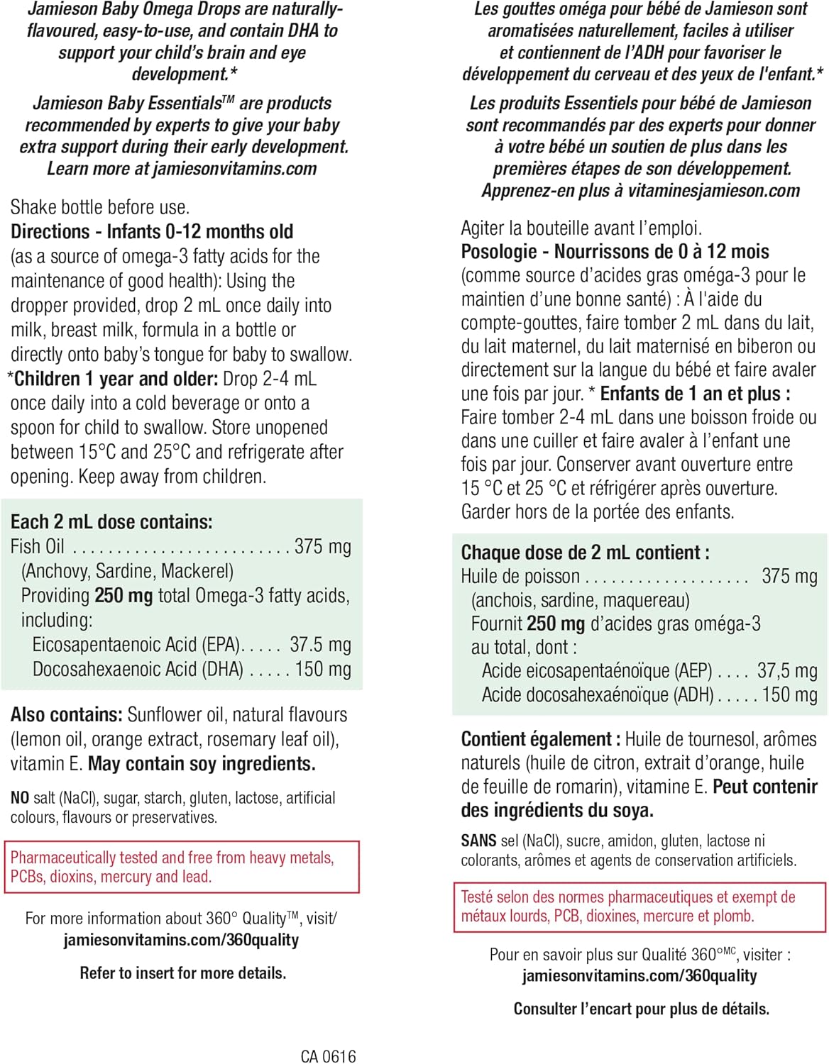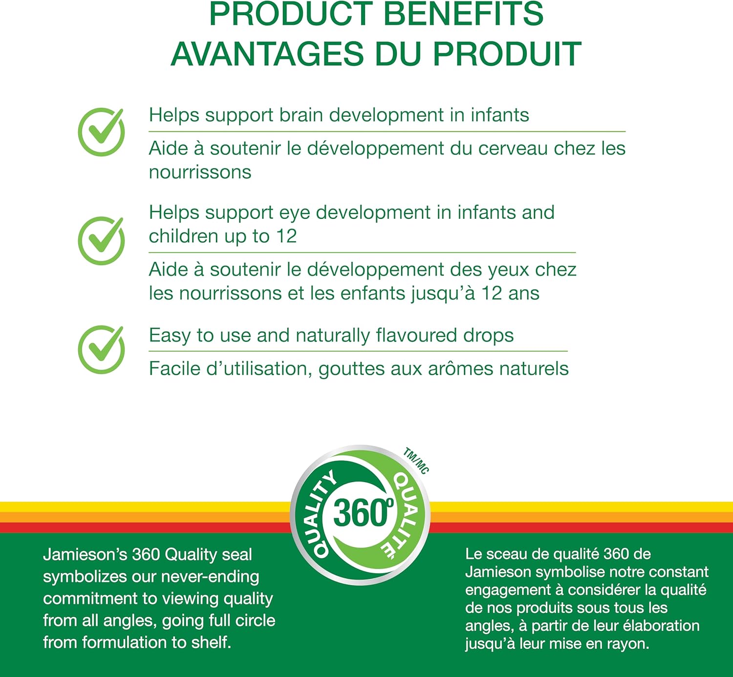 Jamieson 婴儿 Omega-3 滴剂,富含 EPA 和 DHA,加拿大制造,支持大脑和眼睛发育。天然香料,不含麸质、人工色素、香精或防腐剂,60 毫升