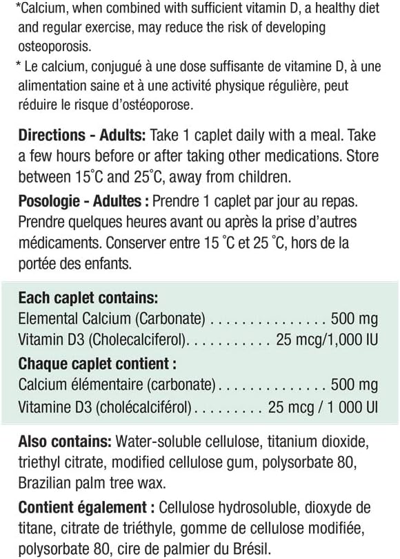 Jamieson 钙片 500 毫克加维生素 D3 1,000 IU,旨在支持骨骼健康,并增强免疫力。每片含 500 毫克钙,有助于维持骨骼和牙齿健康。添加 1,000 IU 维生素 D3,有助于身体吸收和利用钙,同时增强免疫系统。钙与充足的维生素 D、健康饮食和规律运动相结合,可以降低患骨质疏松症的风险。