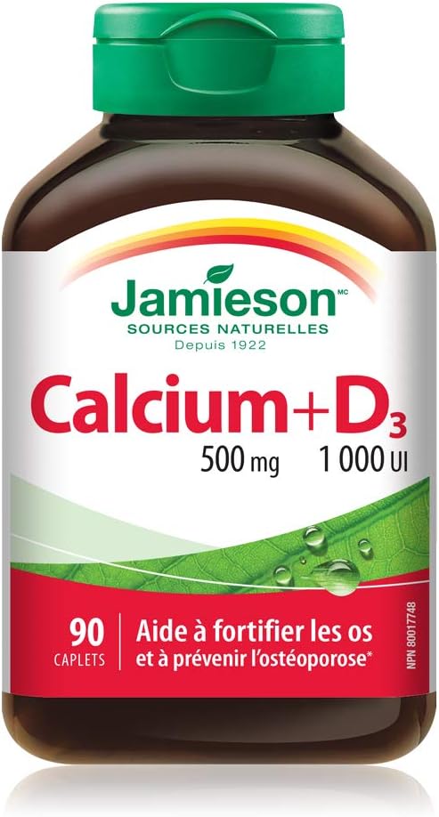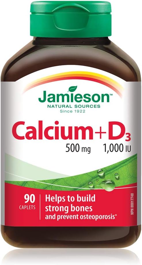 Jamieson 钙片 500 毫克,含 1,000 国际单位维生素 D3,高吸收率,支持骨骼健康,有助于预防骨质疏松症和骨质流失。易于吞咽,素食,非转基因,无麸质,90 粒胶囊,加拿大制造