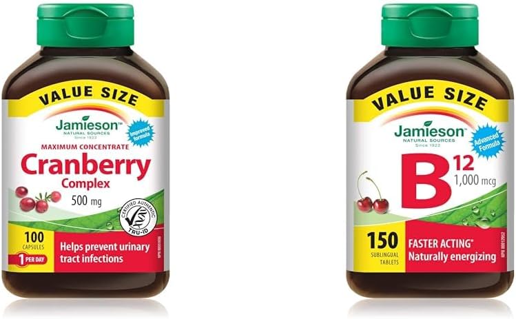 Jamieson 蔓越莓复合物 500 毫克最大浓缩物 - 超值装,素食,非转基因,无麸质,100 片(1 包)和维生素 B12 甲钴胺 1,000 微克速溶片 - 超值装