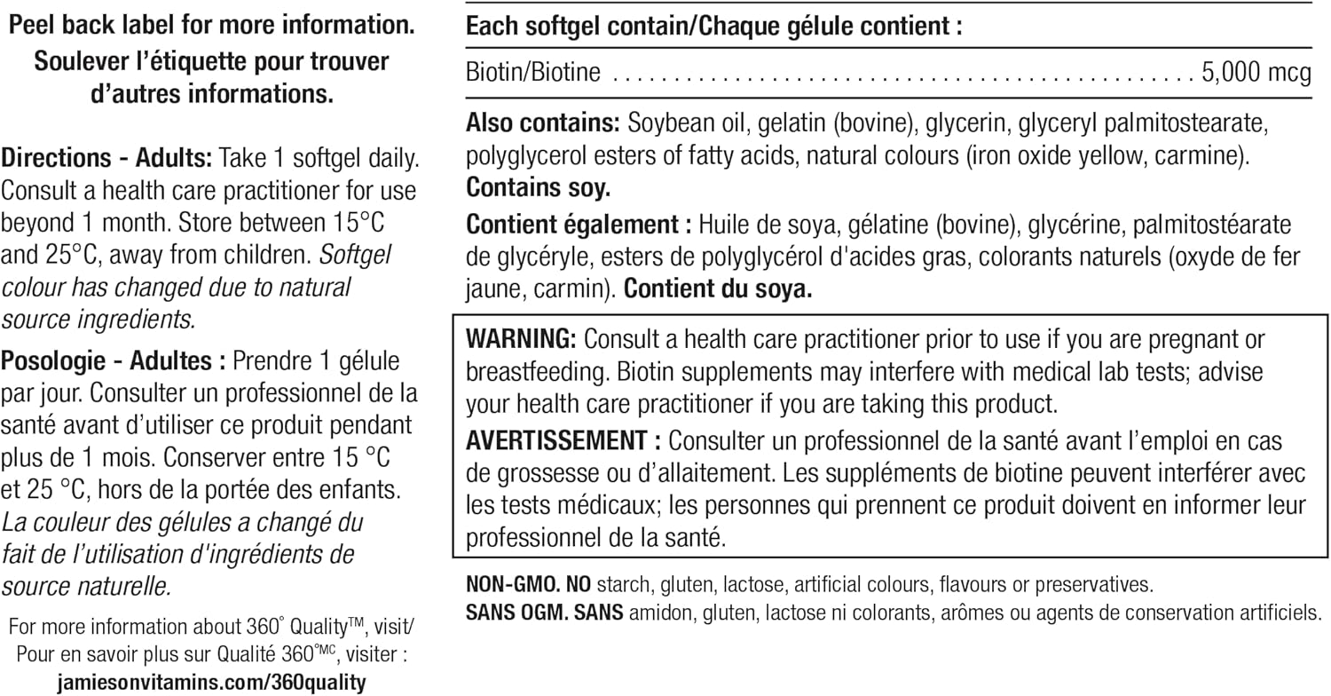 Jamieson 强效生物素 5,000 微克软胶囊,易于吞咽,有助于增厚头发、改善皮肤健康、强韧指甲。不含麸质,不含人工香料、色素或防腐剂,60 粒装,加拿大制造