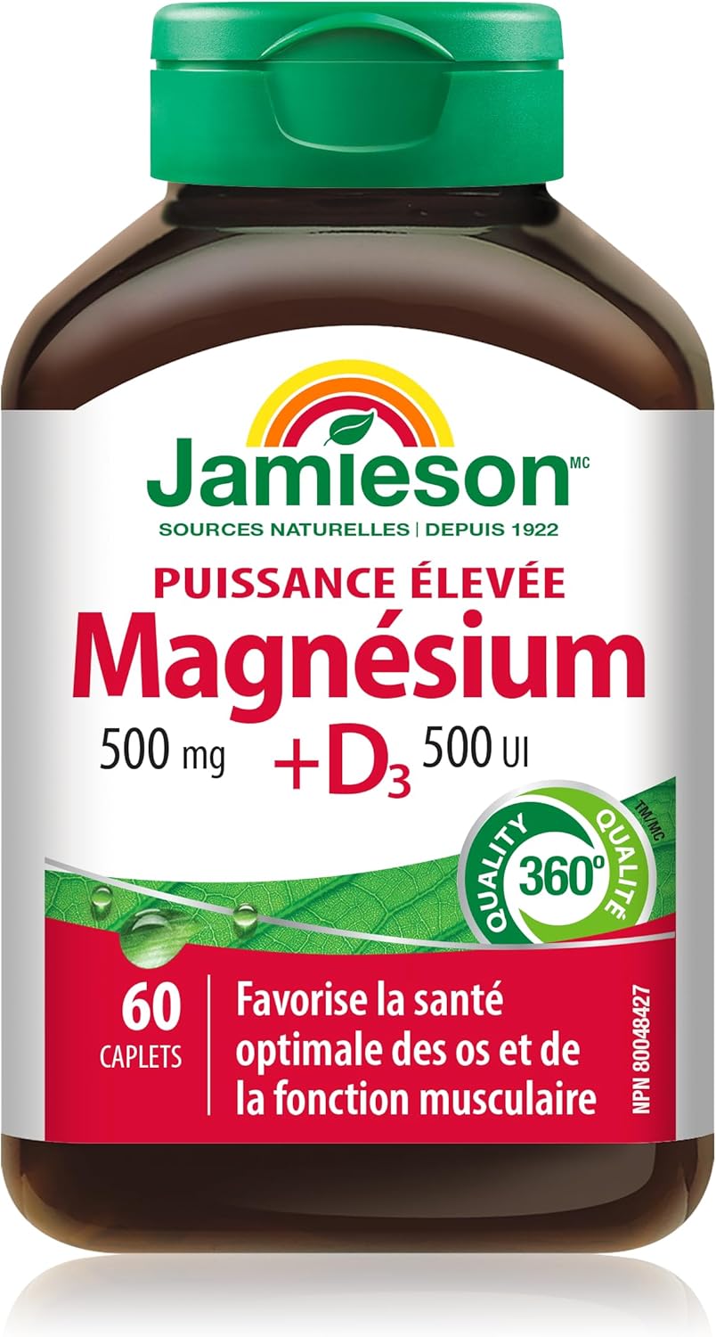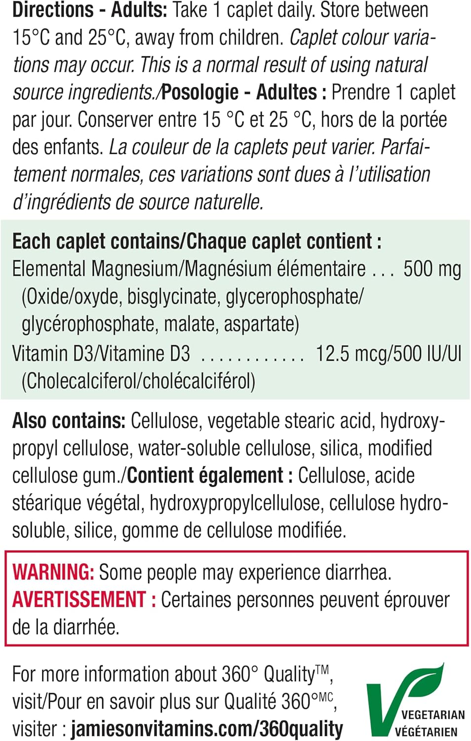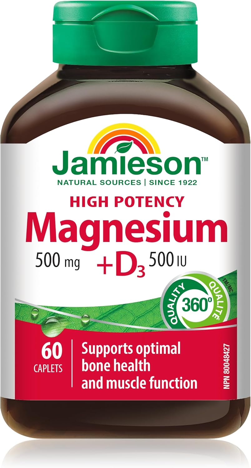 Jamieson 强效镁片 500 毫克,含 500 国际单位维生素 D3,高吸收率,5 种镁源,支持骨骼健康和肌肉功能。素食,非转基因,无麸质,60 粒胶囊,加拿大制造