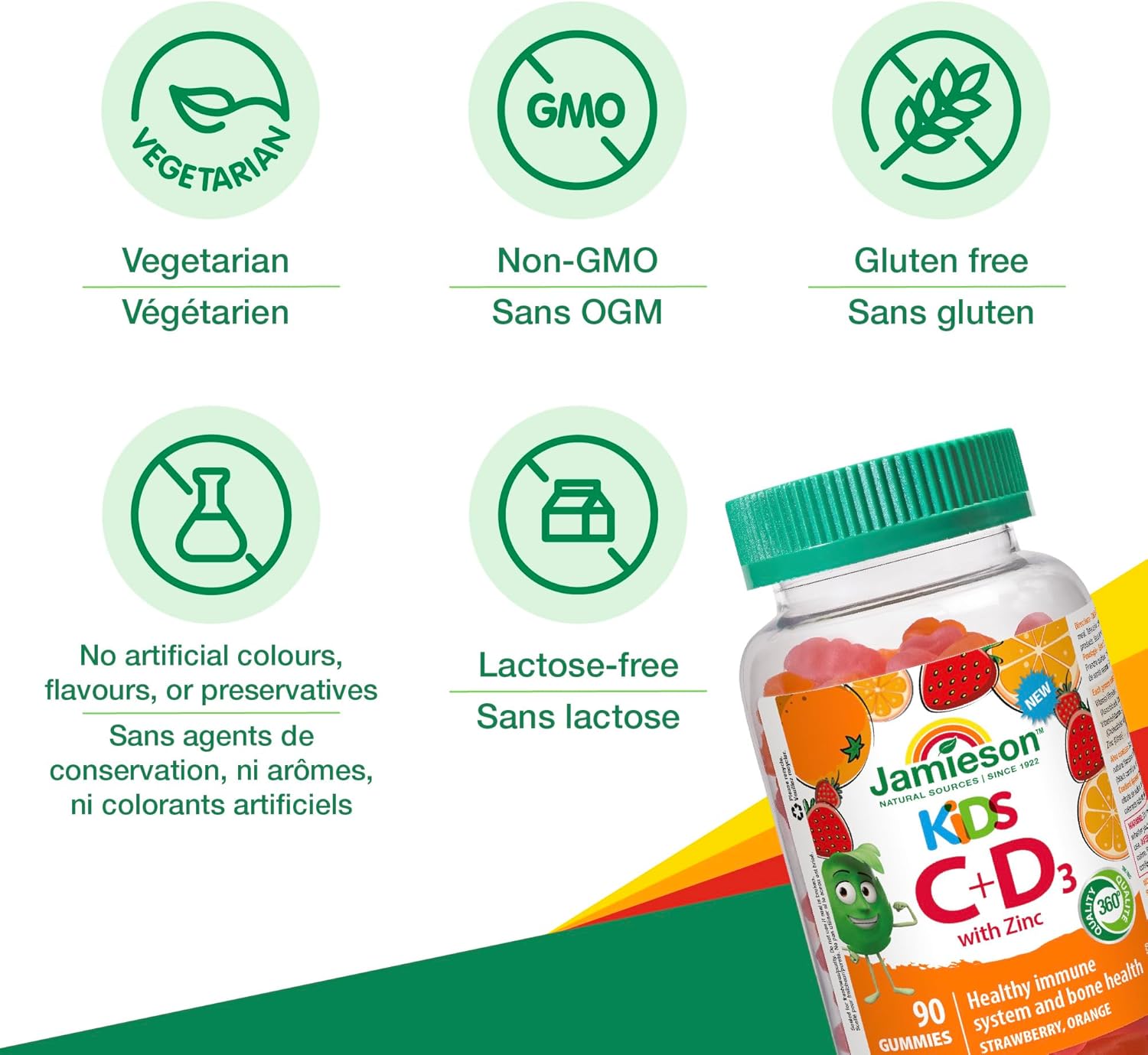 Jamieson 儿童维生素 C + D3 锌软糖,美味又有趣,有助于增强孩子的免疫系统和骨骼健康。每颗素食水果味软糖富含 75 毫克维生素 C、500 国际单位维生素 D3 和 3 毫克锌。